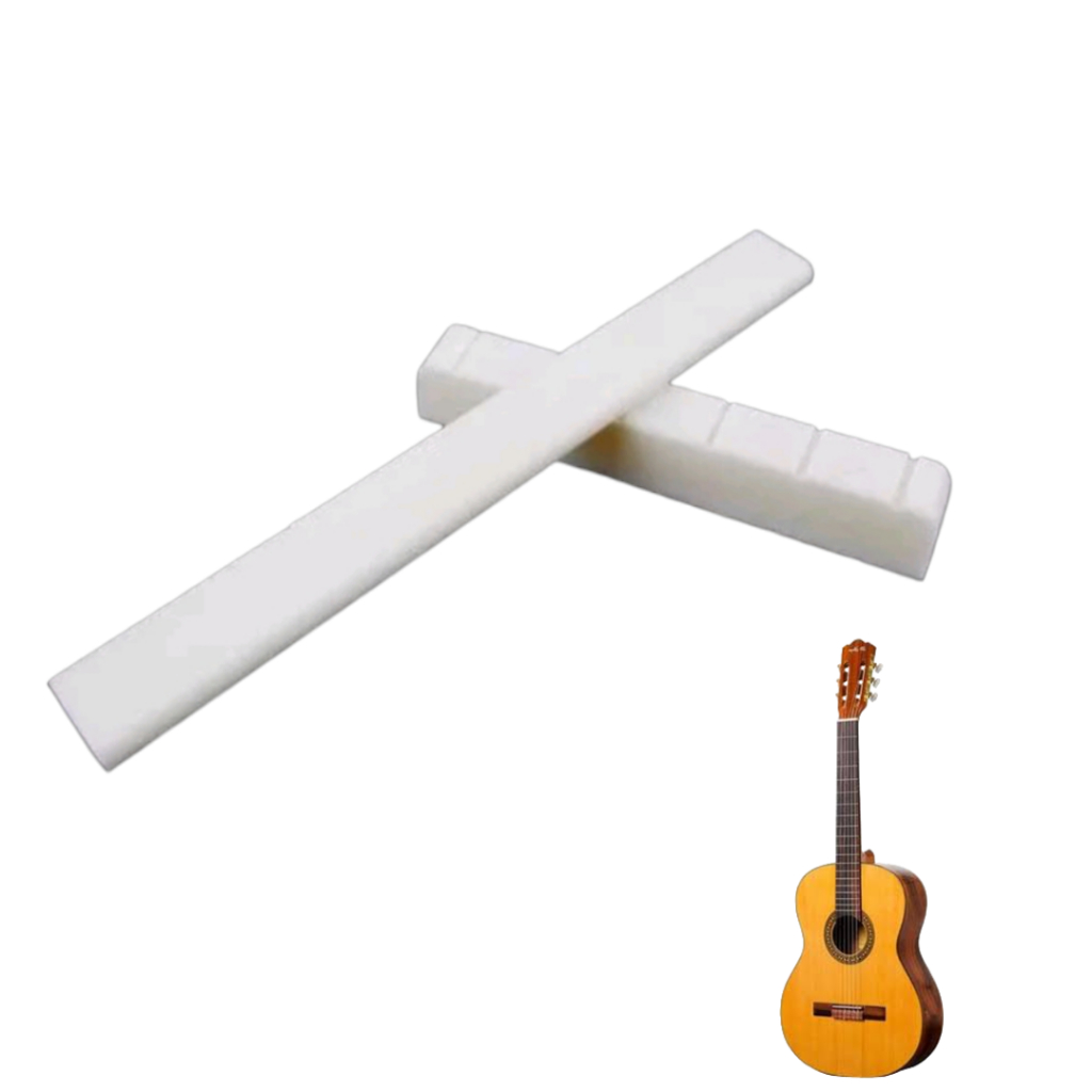 Marca - GOLD acessorios musicais Modelo tradicional Fabricado com ABS de alta qualidade e material de nylon de excelente durabilidade Medidas conforme imagem É apropriado para violão aço Cor: branco natural do osso Material: osso animal tratado Peso total: 6g Pais de origem - China *Pacote inclui: 1 rastilho 80mm ; 1 pestana 52mm ***Produto de excelente qualidade e a pronta entrega.