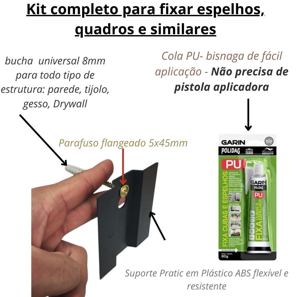 Kit com 1 Suporte + 1 bisnaga de cola 80gr fixa espelho, 2 calços de apoio 1 parafuso flangeado 5x45mm e 1 bucha universal 8mm para todo tipo de estrutura: parede, tijolo, bloco, gesso, DryWall. - Cola PU com bico dosador fixa/cola espelhos e cubas da marca Garin, uma das melhores no mercado - Aplicação prática da cola, por ser em formato de bisnaga não precisa da ferramenta "aplicador de silicone". O Suporte Espelho Pratic deve ser aplicado na face traseira do espelho, deixando sua instalação simples, e permitindo o manuseio para limpeza ou mudança de local, além de evitar desperdícios de materiais para os vidraceiros. ------Pode ser utilizado também para fixar quadros e placas diversas------ Cada suporte tem carga máxima de até 10kg, caso o espelho ultrapasse este peso ou possua formato diferenciado, como por exemplo retangular, poderá ser necessário utilizar mais de 1 suporte para fixação do espelho. Enviamos: 1 Suporte, 2 calços de apoio 1 bisnaga de cola fixa espelho 80gr, 1 parafuso 5x45mm e 1 bucha universal 8mm. Instalação: ( veja o vídeo nas fotos do anúncio, pelo Computador) Fixação deve ser feita com cola PU específica para espelho, Fixa Espelho, (já inclusa no kit) para evitar Oxidação e garantir, fixação segura e confiável. O Suporte colado adequadamente é capaz de suportar 1 metro quadrado de espelho que tenha até 4mm de espessura, para espelhos com espessura de 6mm ou mais, deve-se observar o peso máximo recomendado de 10Kg. Vantagens do kit fixa espelho Pratic: - Segurança - Qualidade - Inovação Orientações gerais para Aplicação do Suporte Espelho Pratic 1- Faça a limpeza na parte detrás do espelho e do suporte e elimine qualquer tipo de gordura na superfície das peças; 2- Com uma régua ou nível de mão, faça na peça as marcações de onde serão colados os suportes, de forma que estes fiquem alinhados; 3- Aplicar a cola em quantidade razoável sobre a base do suporte e em seguida pressionar levemente sobre o local de fixação, importante não pressionar demais o suporte na hora da colagem senão a camada de cola ficará muito fina e isso prejudicará a qualidade da fixação. 4- Não se deve mexer nos suportes logo após serem colados no espelho, pois isso prejudicará a qualidade da fixação 5- Após colar os suportes, aguarde 24 horas para que a cola seque por completo. 6- Passadas 24horas, verifique a qualidade da colagem, recomendamos forçar levemente o suporte com a mão a fim de atestar a eficácia da colagem. Em caso de erro no processo de colagem, basta repetir corretamente. Ressaltamos que a colagem de forma correta e nas superfícies recomendadas é extremamente eficiente e segura, basta seguir o passo a passo.