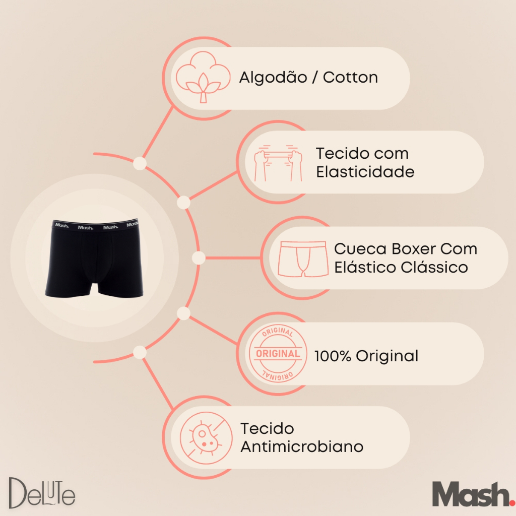 Kit com 10 Cuecas Boxer Cotton Mash Ref. 110.20 Atenção: O kit será composto com 10 cuecas que serão enviadas de acordo com estoque disponivel de maneira sortida Adquira o conforto e a qualidade que você merece com o nosso Kit composto por 10 cuecas modelo boxer da Mash. Confeccionadas em cotton, uma combinação de algodão com elastano, essas cuecas proporcionam maior elasticidade e ajuste perfeito ao corpo, garantindo bem-estar durante todo o dia. Características: Elástico de 4 cm: Cintura com elástico repetitivo e padrão consagrado da Mash, oferecendo suporte firme e confortável. Modelagem Boxer Curta: O modelo mais usado atualmente, combinando design discreto e moderno. Tecido Macio e Maleável: Confecção em 95% algodão e 5% elastano, que se molda ao corpo com muito conforto. Três Opções de Cores: Escolha o kit que mais combina com você. Tamanhos Disponíveis: P: Veste do 38 ao 40 M: Veste do 42 ao 44 G: Veste do 46 ao 48 GG: Veste do 50 ao 52 Benefícios: Ajuste Perfeito: Graças à combinação de algodão e elastano, as cuecas se adaptam ao seu corpo, oferecendo maior liberdade de movimento. Ótimo Custo-Benefício: Adquira 10 cuecas de alta qualidade por um preço especial. Aproveite essa oportunidade e garanta já o seu kit de cuecas boxer Mash, com o melhor da qualidade e conforto que só a Mash pode oferecer! Cores e suas respectivas composição: Cinza chumbo, Preta, Azul Marinho, Azul Jeans e Branca: - 95% Algodão e 5% Elastano Cinza Mescla: - 84% Algodão - 4% Elastano - 12% Poliéster Cinza Mescla Escuro: - 46% Algodão - 4% Elastano - 48% Poliéster