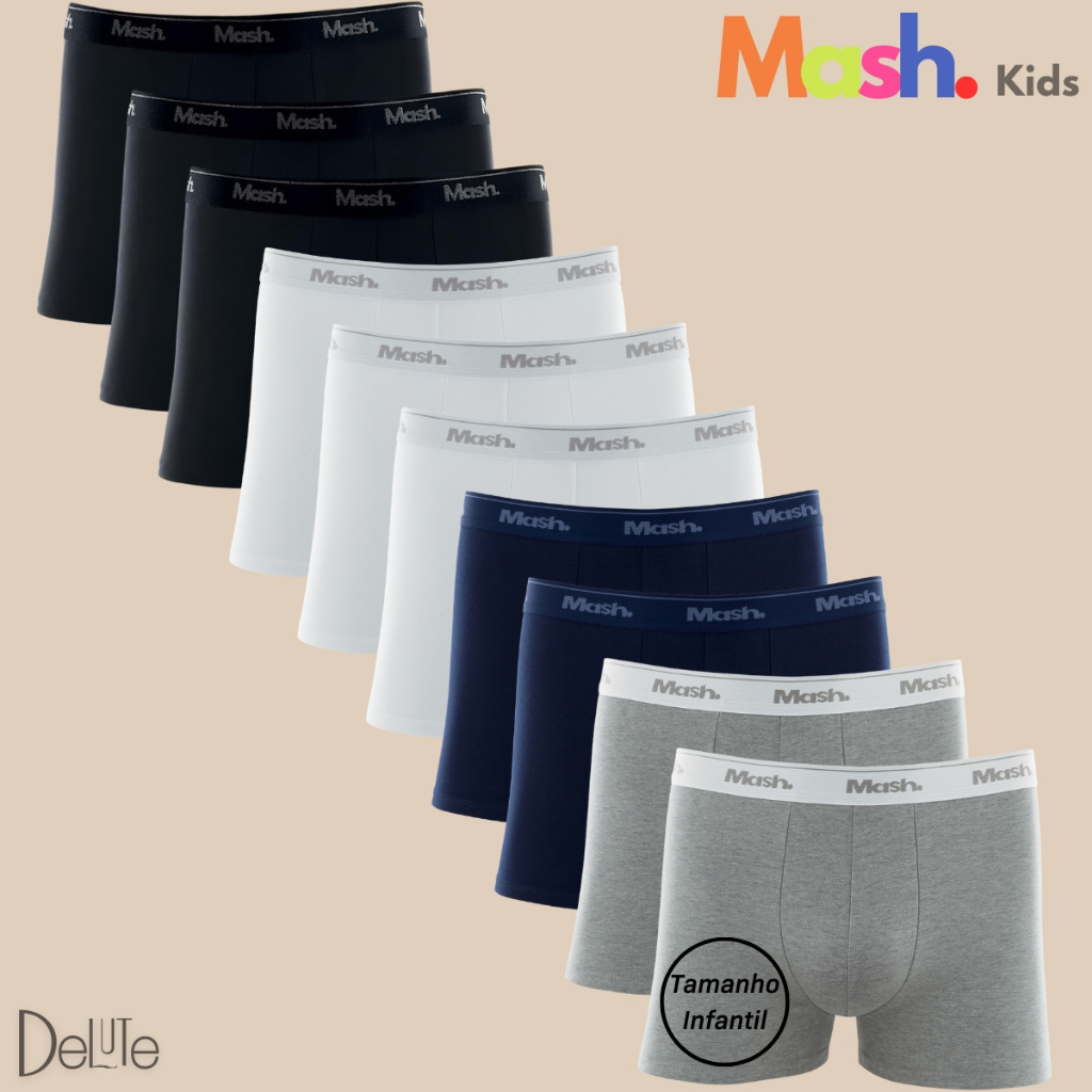 Kit com 10 Cuecas Boxer Infantil em Algodão Mash Ref. 111.19 Atenção: O kit será composto com 10 cuecas que serão enviadas de acordo com estoque disponivel de maneira sortida O modelo boxer infantil oferece todos os benefícios necessários para o seu pequeno. Sua composição em algodão garante respirabilidade e conforto ao longo do dia. As cuecas são lisas, com elástico sobreposto no cós, apresentando o nome da marca. A modelagem ajustada proporciona total aderência e adaptação ao corpo dos meninos, tornando-as extremamente confortáveis. São ideais para o uso diário, oferecendo bem-estar aos pequenos. Características: - Confeccionadas com elástico repetitivo. - Seguem o padrão consagrado da Mash. Tamanhos disponíveis: - P (2 a 4 anos) - M (5 a 7 anos) - G (8 a 10 anos) - GG (11 a 13 anos) Composição: - Cinza mescla claro: 88% algodão / 12% poliéster - Cinza mescla escura: 50% algodão / 50% poliéster - Demais cores: 100% Algodão