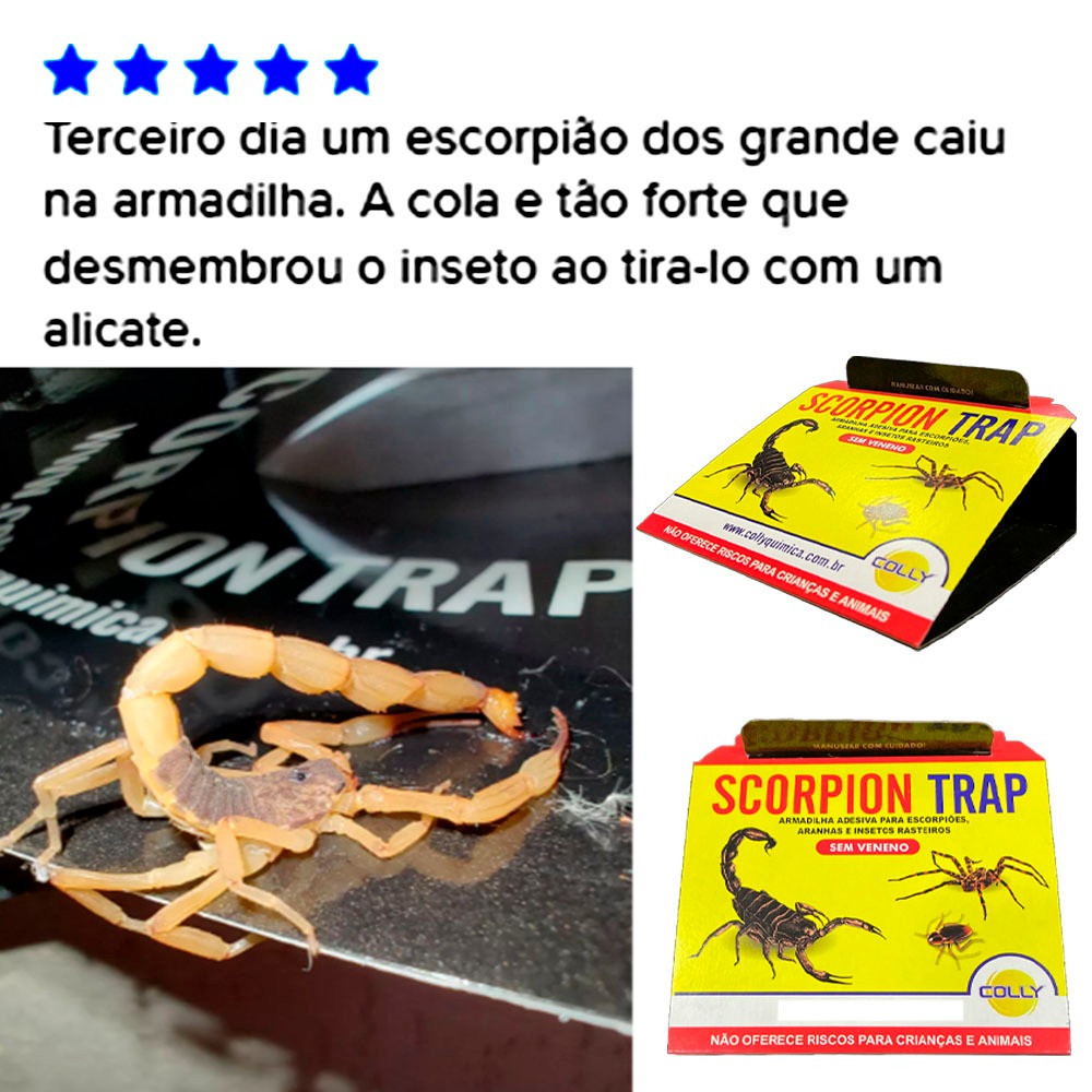 Escorpiões ou insetos rasteiros aparecendo dentro de casa? Esses visitantes indesejados podem representar riscos à saúde e ao bem-estar da sua família, principalmente em ambientes internos, onde crianças e pets circulam. Pensando nisso, a Scorpion Trap Colly foi desenvolvida para oferecer uma forma segura, prática e eficiente de capturar escorpiões e outros insetos rasteiros, sem veneno e sem produtos químicos. Com cola super adesiva de alta eficiência, a armadilha captura os insetos de forma eficaz e discreta. Não possui cheiro, não libera substâncias tóxicas e pode ser utilizada com tranquilidade em ambientes domésticos. Além disso, o produto é pronto para uso: basta abrir, posicionar no local estratégico e deixar agir. Benefícios: • Produto atóxico • Sem veneno e sem odor • Fácil montagem com dobras e travas integradas • Ideal para áreas internas cobertas • Alta eficiência na captura de pragas rasteiras • Produto original da marca Colly • Pronto para uso imediato Informações Técnicas: • DIMENSÃO: 25 cm x 13 cm x 13 cm • Produto atóxico • Compatível com controle passivo de pragas rasteiras • Acompanha sistema de dobra com trava Modo de Uso: 1. Retire a película protetora da cola 2. Dobre a armadilha conforme as marcações e encaixe a trava 3. Identifique locais de passagem ou abrigo das pragas 4. Posicione a armadilha próxima à parede 5. Mantenha distância de 2 a 4 metros entre armadilhas 6. Em caso de captura, descarte com segurança Observações: • Em caso de contato com a pele, limpa com óleo mineral e lavar com água e sabão. Locais de Uso Indicados: • Casas e apartamentos • Escolas, creches e instituições públicas • Hospitais, clínicas e consultórios • Restaurantes, padarias e comércios • Garagens, depósitos e áreas de risco rasteiro Precauções: • Em caso de contato com a pele, remova com óleo mineral e lave com água e sabão • Não utilizar em áreas externas sem cobertura Sobre a MIP DIGITAL: A MIP DIGITAL é uma empresa especializada em soluções para o monitoramento e controle seguro de pragas urbanas. Trabalhamos com produtos de alta qualidade, desenvolvidos para oferecer eficiência, segurança e praticidade no controle de roedores, insetos rasteiros e voadores. Somos revendedores autorizados da marca Colly e ColeAgró, referência no mercado por oferecer armadilhas adesivas, colas especiais e outros produtos ecológicos, atóxicos e de fácil aplicação. Oferecemos um atendimento ágil e transparente, com envio rápido, nota fiscal, garantia de procedência e embalagem reforçada para preservar seu pedido até a entrega. Conte com a MIP DIGITAL para manter seu ambiente limpo, seguro e livre de pragas, com produtos confiáveis e soluções inteligentes.