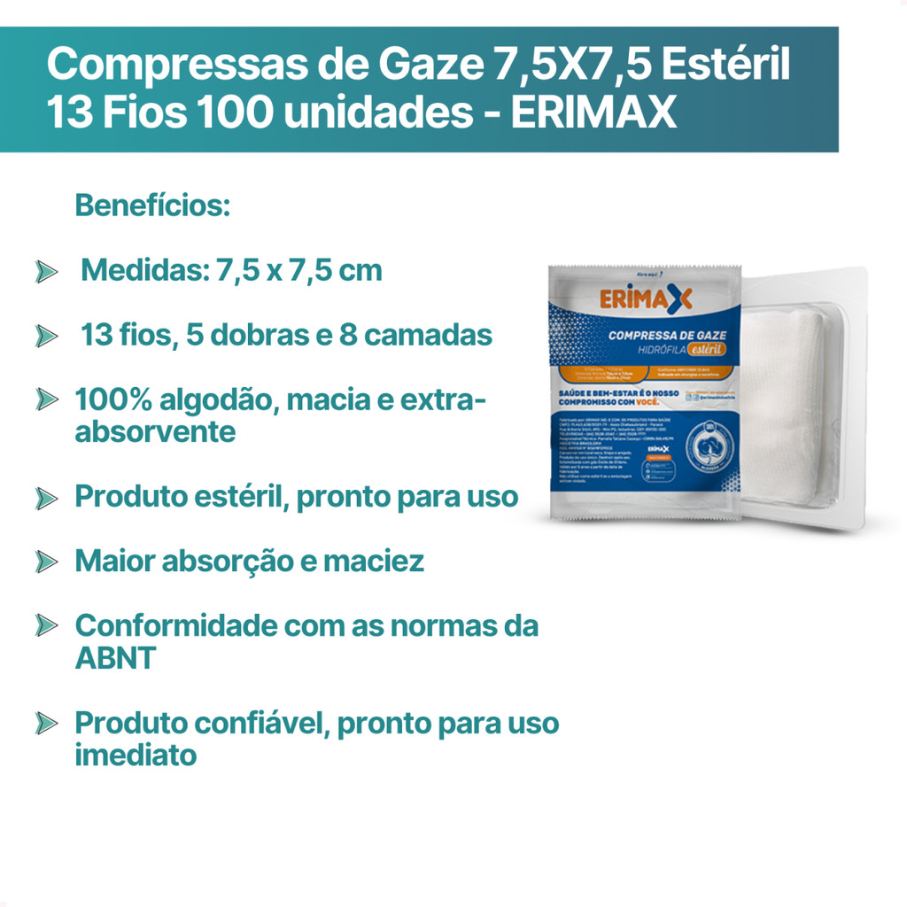 Seja bem-vindo(a)! Kit com 100 Compressas de Gaze 7,5X7,5 Estéril 13Fios ERIMAX A Compressa de Gaze Hidrófila Estéril ERIMAX foi desenvolvida para oferecer máxima segurança, absorção e controle microbiológico, sendo indispensável em centros cirúrgicos, clínicas, consultórios e hospitais. Produzida em 100% algodão e esterilizada por óxido de etileno, possui tramas bem definidas, é macia, atóxica e extra-absorvente, garantindo proteção e eficiência em diversos procedimentos. Características da Compressa de Gaze ERIMAX: - Medidas: 7,5 x 7,5 cm - 13 fios, 5 dobras e 8 camadas - 100% algodão, macia e extra-absorvente - Produto estéril, pronto para uso Para que serve a compressa de gaze ERIMAX? Indicada para: - Curativos estéreis e cobertura de ferimentos - Cirurgias em geral - Primeiros socorros - Antissepsia da pele e mucosas Benefícios: - Maior absorção e maciez - Conformidade com as normas da ABNT - Produto confiável, pronto para uso imediato Higiene e Conservação: - Conservar em temperatura ambiente (15 - 30°C) - Proteger do sol, calor e umidade - Manter lacrado até o uso - Uso único ? proibido reprocessar - Não utilizar se a embalagem estiver violada, rasgada ou molhada QUEM SOMOS? Desde 1990 atuamos com foco em licitações públicas para atendimento a hospitais e clínicas médicas do ES. Somos reconhecidos pelos setores público e privado como um dos melhores e mais eficientes distribuidores de produtos hospitalares, afinal, estamos presentes nos 78 municípios capixabas, na Secretaria da Saúde Estadual e em mais de 800 clientes da rede privada, incluindo também empresas de Remoção, Home Care, Clínicas Odontológicas, Dentais, Distribuidores, Drogarias, Clínicas Veterinárias, dentre outros.