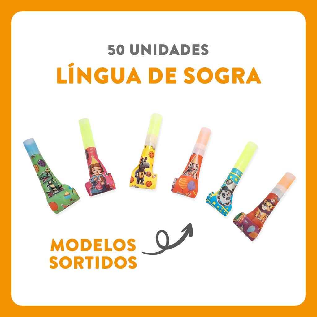 BENEFÍCIOS: • Kit com 50 Línguas de Sogra + 50 Cornetas para festas • Ideal para sacolinhas surpresa e lembrancinhas • Cores e modelos sortidos • Leves, divertidos e seguros para crianças • Itens entregues fechados e prontos para uso 🏷️ Marca: Fabricação Própria 🛠️ Material: Papel (línguas de sogra) e plástico (cornetas) 📏 MEDIDAS: Língua de sogra: 10x230mm (aberta) - Corneta: 9x54mm ⚠️ Não recomendado para menores de 3 anos. ℹ️ IMPORTANTE: Compra Segura Com Garantia Shopee ✅ Somos Vendedores Indicados Pela Shopee. ✅ Enviamos dentro de 6 horas úteis.✅