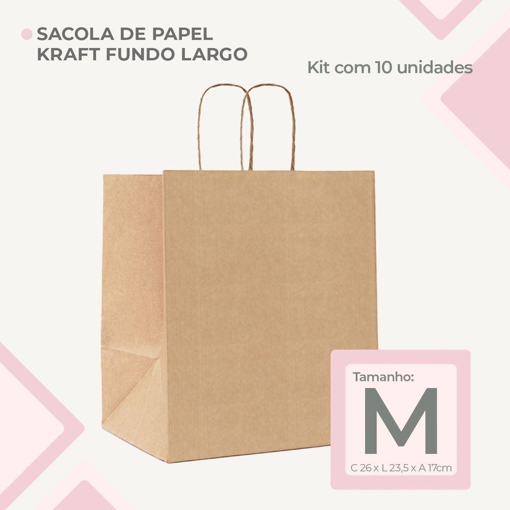 Kit com 10Un de Sacolas de Papel Kraft Média Fundo Largo Biodegradável e Reciclável 26x23,5x17cm