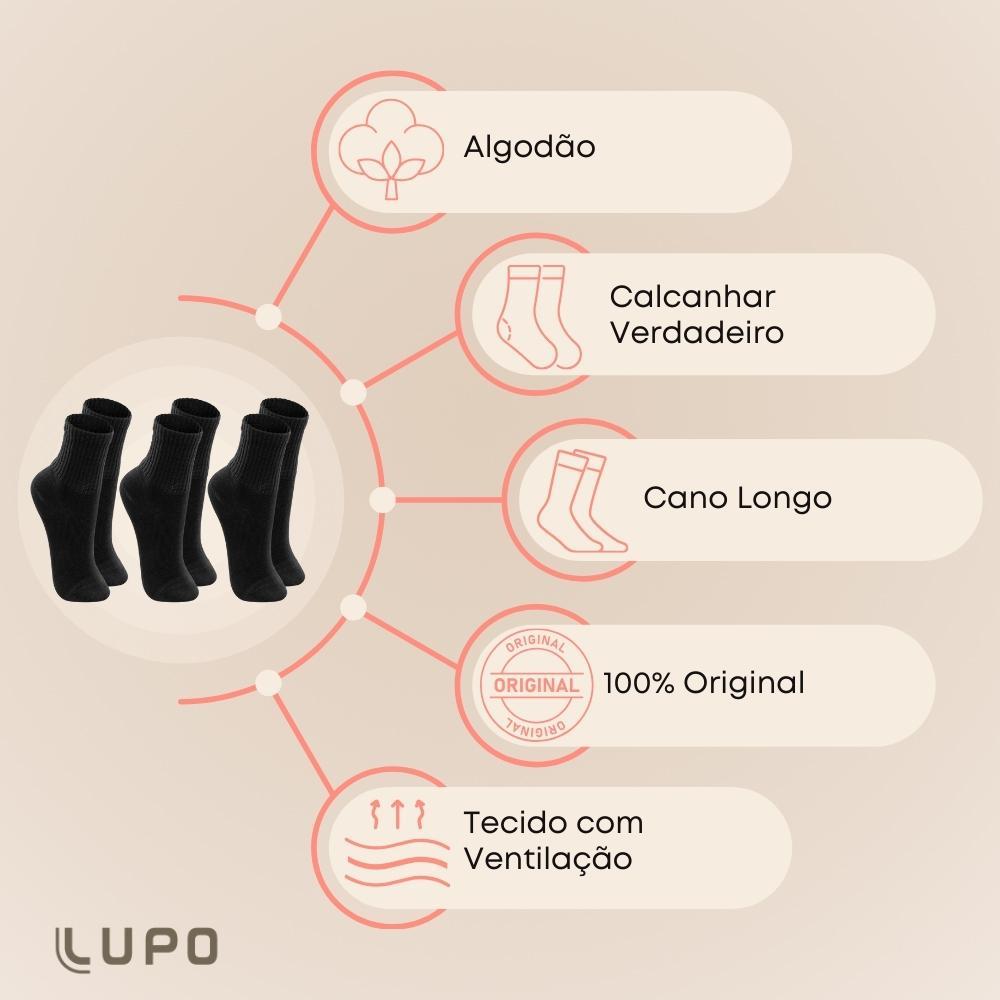 Kit De Meia Lupo Kids Cano Médio Infantil Algodão Ref. 2727 - Original Kit de meias Lupo Sport, confeccionadas em algodão penteado super macio e confortável. Cano médio, adornadas por logotipo da marca punho canelado com calcanhar verdadeiro, com isso, evitando que a meia saia do lugar durante o uso. Possui tecnologia atoalhada, o que facilita a absorção do suor diminuindo o odor nos pés. Excelente custo benefício na compra do kit. O bico e o calcanhar foram reforçados para maior conforto e durabilidade, costuras firmes, interior respirável e macio. - Calcanhar verdadeiro. - Ajuste perfeito. - Maior conforto. - Punho soft. Tamanhos: M - (calcados 24 a 29) G - (calcados 30 a 35) Composição: 74% Algodão, 24% Poliamida e 2% Outras Fibras Descrição da Marca Lupo é uma das maiores e melhores fabricantes de moda íntima e meias. Em 1947 a empresa já era o maior fabricante de meias masculinas do Brasil, a partir de 1990 a Lupo ampliou sua linha de produtos, e hoje é uma das marcas mais conhecidas neste ramo.