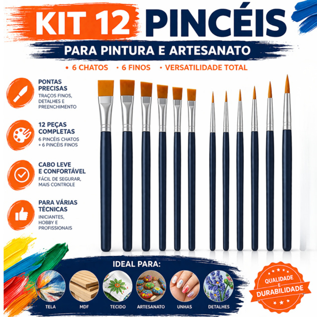 | Kit com 12 Píncéis para Pintura Artesanato, Ponta Chata, Ponta Redo... este produto | R$ 19,90 | 23% | 4.8/5 | 120 |
