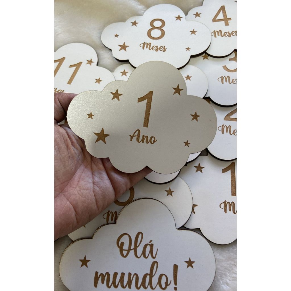 Kit com 13 Plaquinhas Mêsversário Nuvem em MDF – Branco 3mm | Tema Nuvem para Fotos de Bebês