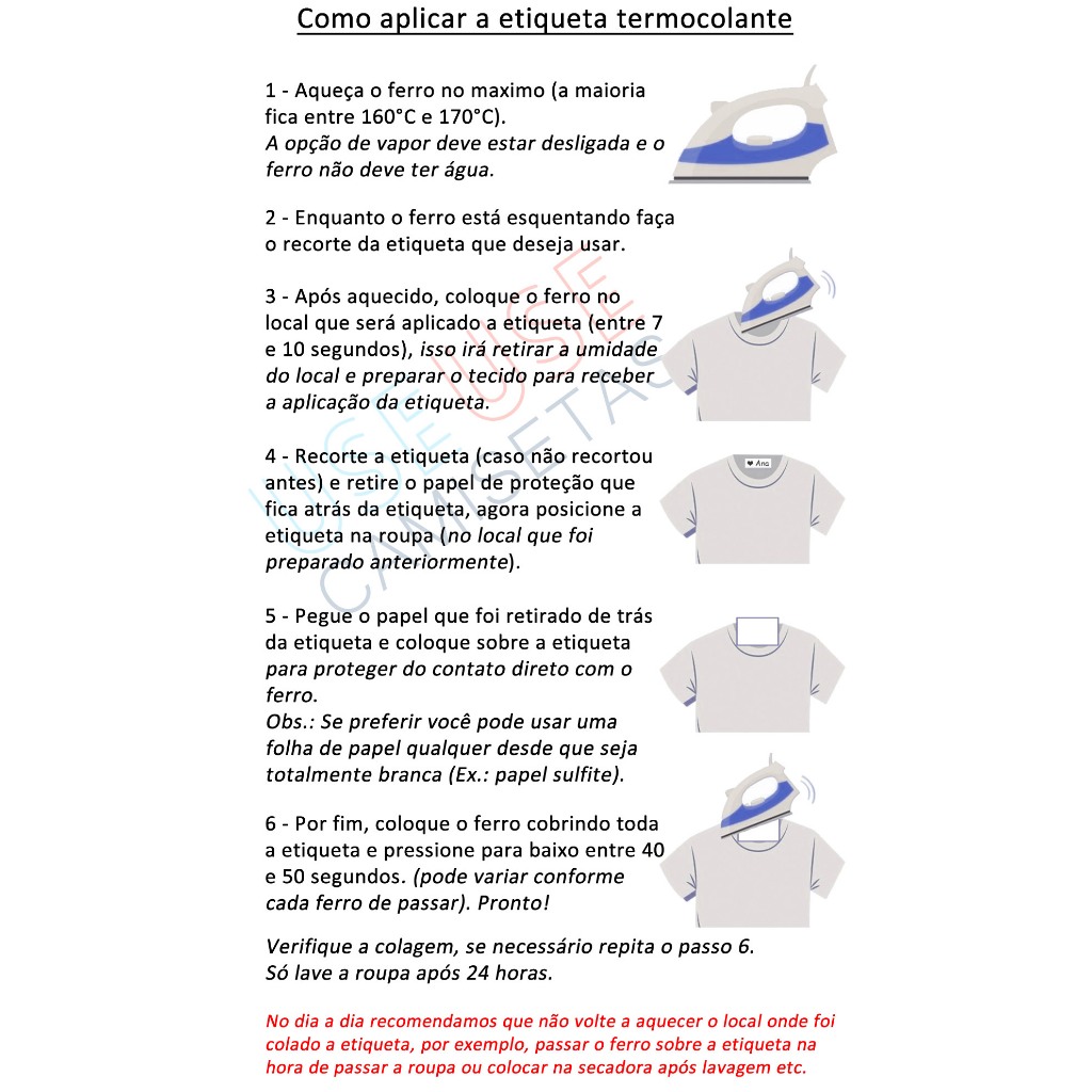 ETIQUETAS TERMOCOLANTES de 5 x 1,2 CM Largura x Altura (RETANGULAR) para IDENTIFICAÇÃO de roupas e assim não perdê-las mais, pode ser colada nas roupas como uniformes, camisetas, shorts e tecidos em geral. - Podem ser aplicadas em qualquer tipo de tecido desde que o mesmo tenha aderência e que suporte a temperatura do ferro de passar. - Podem ser aplicadas em roupas/tecidos de qualquer cor, pois as etiquetas tem o fundo branco (igual mostrado na foto do anúncio). - Feitas em tecido, super confortáveis, não incomoda/irrita ao tocar a pele. - São estampados com estampa ANTITRINCAGEM, não trincam com o tempo. - Não sai na lavagem - Você escolhe a IMAGEM e o NOME que desejar. - Já vai com a imagem e o nome estampados, é só recortar e aplicar, fácil fácil :) - Fácil de aplicar (veja as instruções nas imagens do anúncio). - Fácil de cortar (pode ser usado tesoura comum). - Enviamos junto as instruções de aplicação (passo a passo). Lembrando que tudo depende da correta aplicação no tecido, por isso é fundamental que você siga as instruções corretamente na hora da aplicação :)