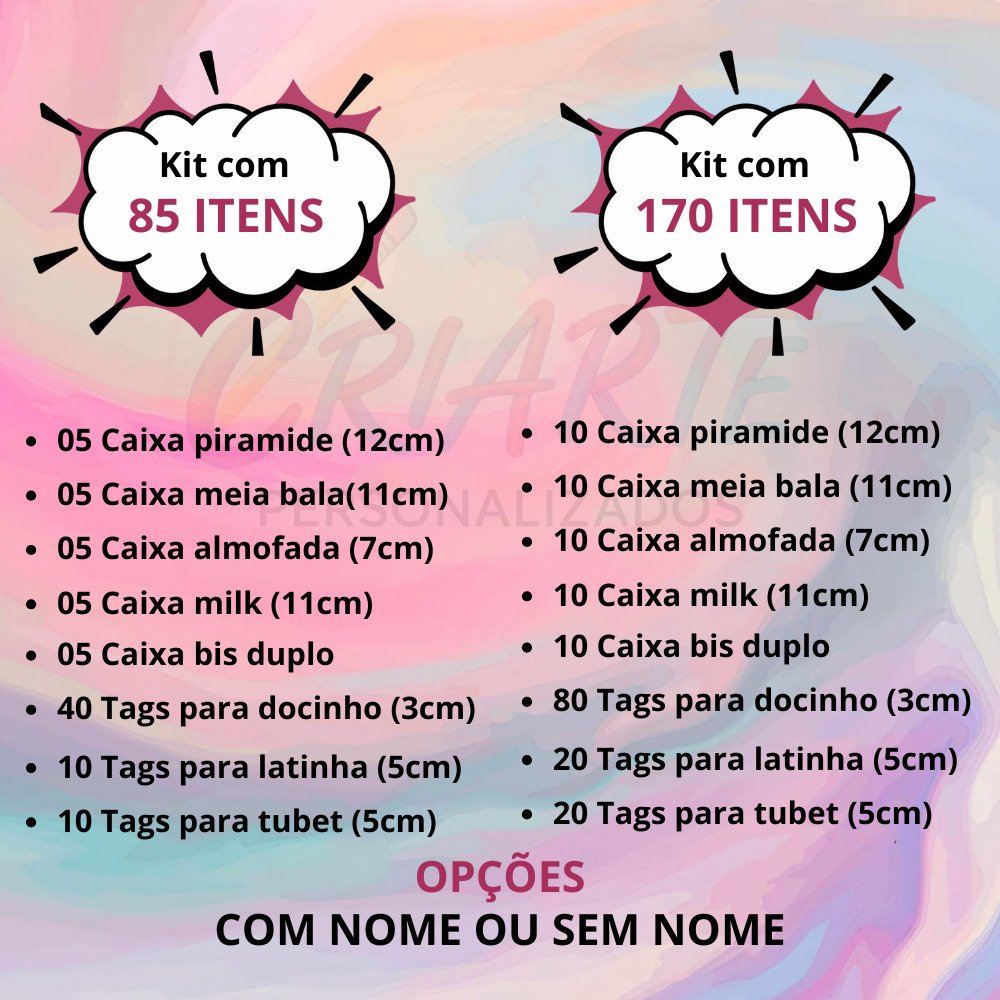 LEIA COM ATENÇÃO Arte de acordo com imagem do anúncio: ROBLOX Produtos sem nome: Envio Imediato (Exceto fins de semana) Produtos com nome: Envio de até 3 dias úteis Caso não seja enviado nome e idade dentro do prazo de 24H, o produto será coletado sem informações KIT CONTÉM 85 ITENS ⬇️KIT SEM ALTERAÇÃO E ARTE PADRÃO DA LOJA, CONTENDO: 05 CAIXAS MEIA BALA (11CM) 05 CAIXAS MILK (11CM) 05 CAIXA MINI ALMOFADA (7CM) 05 CAIXAS PIRÂMIDES (12CM) 05 CAIXAS BIS DUPLO 10 TAGS PARA LATINHAS (5CM) 10 PARA TUBETES (5CM) 40 TAGS PARA DOCINHO (3CM) KIT CONTÉM 170 ITENS ⬇️KIT SEM ALTERAÇÃO E ARTE PADRÃO DA LOJA, CONTENDO: 10 CAIXAS MEIA BALA (11CM) 10 CAIXAS MILK (11CM) 10 CAIXA MINI ALMOFADA (7CM) 10 CAIXAS PIRÂMIDES (12CM) 10 CAIXAS BIS DUPLO 20 TAGS PARA LATINHAS (5CM) 20 PARA TUBETES (5CM) 80 TAGS PARA DOCINHO (3CM) OBSERVAÇÕES: SÃO FOLHAS PARA RECORTE (cliente recorta, dobra e cola). PRODUZIDO EM PAPEL FOTOGRÁFICO 180G; KIT SEM SUBSTITUIÇÕES DE ITENS; NÃO INCLUSO LAÇOS; NÃO ACEITAMOS CANCELAMENTOS PÓS COMPRA; ENVIAMOS VÍDEO ILUSTRATIVO DE COMO MONTAR (solicitar no chat). IMPORTANTE SABER: As cores das fotos podem não representar fidelidade, podendo sofrer pequenas alterações por causa do monitor de cada computador, as cores podem variar de acordo com o brilho e contraste do seu monitor. Por se tratarem de produtos artesanais e únicos, podem ocorrer pequenas variações. As medidas porém sofrem pequenas diferenças em relação ao corte entre 1 e 2 milímetros