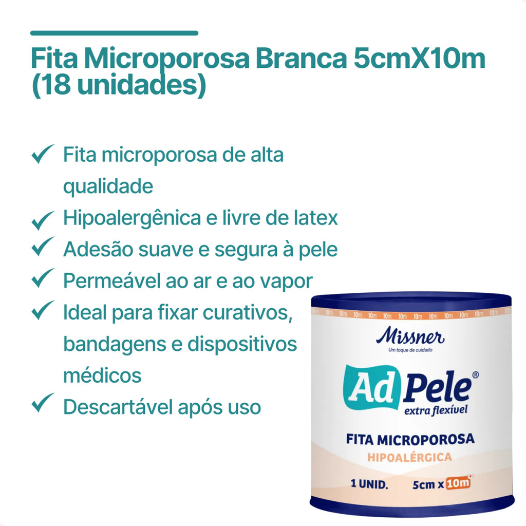 Seja bem-vindo(a)! Kit com 18 - Fita Microporosa Hipoalérgica 5cm X 10m Adpele A Fita Microporosa Extra Flexível da marca AD Pele é ideal para fixações seguras e confortáveis, sendo amplamente utilizada em ambientes hospitalares, clínicos e domiciliares. Com dimensões de 5 cm x 10 m, é perfeita para fixar curativos de grande porte, oferecendo respirabilidade, conforto e adesão eficiente sem agredir a pele. Indicações de uso: - Fixação de curativos grandes - Sondas e drenos - Cateteres - Dispositivos de infusão intravenosa - Bandagens e gazes Diferenciais: - Hipoalérgica: segura para peles sensíveis - Extra flexível: adapta-se facilmente aos contornos do corpo - Cor branca e discreta - Fácil de rasgar ou cortar - Respirável: permite troca gasosa, prevenindo maceração da pele - Adesivo suave, que não deixa resíduos Dimensões: 5 cm x 10 m Marca: AD Pele Cor: Branca QUEM SOMOS? Desde 1990 atuamos com foco em licitações públicas para atendimento a hospitais e clínicas médicas do ES. Somos reconhecidos pelos setores público e privado como um dos melhores e mais eficientes distribuidores de produtos hospitalares, afinal, estamos presente nos 78 municípios capixabas, na Secretaria da Saúde Estadual e em mais de 800 clientes da rede privada incluindo também empresas de Remoção, Home Care, Clínicas Odontológicas, Dentais, Distribuidores, Drogarias, Clínicas Veterinárias, dentre outros.