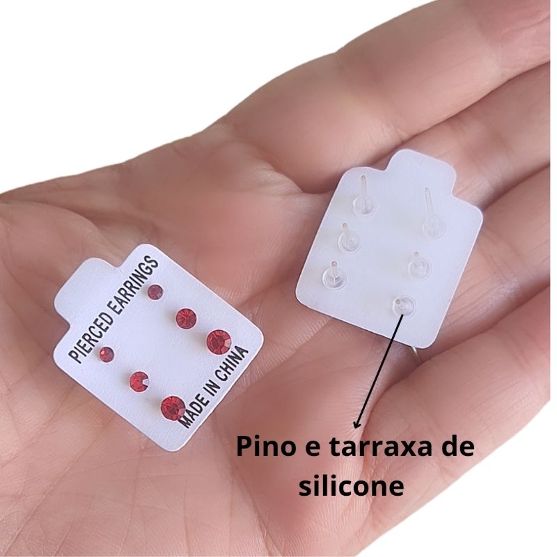 ✔️Kit com 18 pares ✔️Pino de silicone ✔️Tarraxa de silicone ✔️Tamanho 3mm,2mm e 1mm ✔️Modelo de brinco pequeno e delicado ✔️São 3 pares de cada cor ✔️Cores/ Azul, vermelho, preto, rosa seco,roxo e branco. ✔️Modelo enviado igual a foto,cores e modelo ✔️Foto real do Produto.