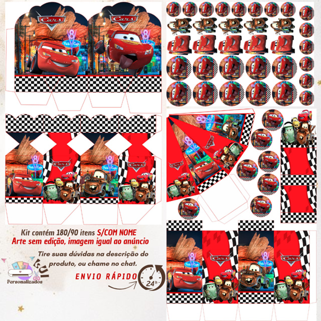 KIT COM 180/90 ITENS LEMBRANCINHAS S/COM NOME TEMA: CARROS RELAMPAGO MCQUEEN (Envio Rápido)