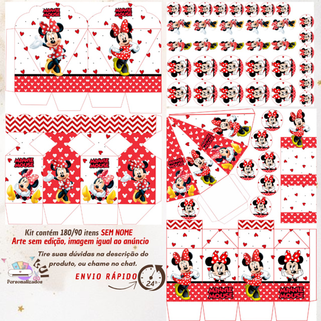 LEIA COM ATENÇÃO Arte de acordo com imagem do anúncio: TEMA: MINNIE VERMELHA Produtos sem nome: Envio Imediato (Exceto fins de semana) CONTÉM: 180 ITENS DIVERSOS ⬇️KIT SEM ALTERAÇÃO, CONTENDO: *10 CAIXAS CORAÇÃO (11CM) *10 CAIXAS MILK (11CM) *10 CAIXAS BIS DUPLO (5CM) *10 CAIXAS MEIA BALA (11CM) *10 CAIXAS PIRÂMIDES (11CM) *20 TAGS PARA LATINHAS (5CM) *20 TAGS PARA TUBETES (5CM) *90 TAGS PARA DOCINHO (3CM) CONTÉM: 90 ITENS DIVERSOS ⬇️KIT SEM ALTERAÇÃO, CONTENDO: *05 CAIXAS CORAÇÃO (11CM) *05 CAIXAS MILK (11CM) *05 CAIXAS BIS DUPLO (5CM) *05 CAIXAS MEIA BALA (11CM) *05 CAIXAS PIRÂMIDES (11CM) *10 TAGS PARA LATINHAS (5CM) *10 TAGS PARA TUBETES (5CM) *45 TAGS PARA DOCINHO (3CM) OBSERVAÇÕES: SÃO FOLHAS SEM RECORTE (cliente recorta, dobra e cola); ENVIAMOS VÍDEO ILUSTRATIVO DE COMO MONTAR; PRODUZIDO EM PAPEL FOTOGRÁFICO 180G; AS TAGS PODEM SER USADAS TBM NAS CAIXAS; NÃO ALTERAMOS MODELOS E NEM ARTE; NÃO INCLUSO LAÇO. IMPORTANTE SABER: As cores das fotos podem não representar fidelidade, podendo sofrer pequenas alterações por causa do monitor de cada computador, as cores podem variar de acordo com o brilho e contraste do seu monitor. Por se tratarem de produtos artesanais e únicos, podem ocorrer pequenas variações. As medidas porém sofrem pequenas diferenças em relação ao corte entre 1 e 2 milímetros.