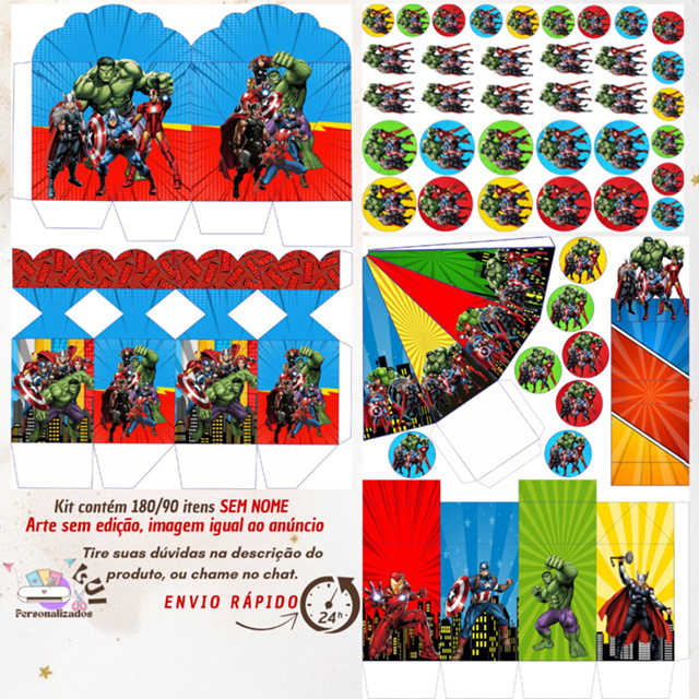 LEIA COM ATENÇÃO Arte de acordo com imagem do anúncio: TEMA: VINGADORES Produtos sem nome: Envio Imediato (Exceto fins de semana) CONTÉM: 180 ITENS DIVERSOS ⬇️KIT SEM ALTERAÇÃO, CONTENDO: *10 CAIXAS CORAÇÃO (11CM) *10 CAIXAS MILK (11CM) *10 CAIXAS BIS DUPLO (5CM) *10 CAIXAS MEIA BALA (11CM) *10 CAIXAS PIRÂMIDES (11CM) *20 TAGS PARA LATINHAS (5CM) *20 TAGS PARA TUBETES (5CM) *90 TAGS PARA DOCINHO (3CM) CONTÉM: 90 ITENS DIVERSOS ⬇️KIT SEM ALTERAÇÃO, CONTENDO: *05 CAIXAS CORAÇÃO (11CM) *05 CAIXAS MILK (11CM) *05 CAIXAS BIS DUPLO (5CM) *05 CAIXAS MEIA BALA (11CM) *05 CAIXAS PIRÂMIDES (11CM) *10 TAGS PARA LATINHAS (5CM) *10 TAGS PARA TUBETES (5CM) *45 TAGS PARA DOCINHO (3CM) OBSERVAÇÕES: SÃO FOLHAS SEM RECORTE (cliente recorta, dobra e cola); ENVIAMOS VÍDEO ILUSTRATIVO DE COMO MONTAR; PRODUZIDO EM PAPEL FOTOGRÁFICO 180G; AS TAGS PODEM SER USADAS TBM NAS CAIXAS; NÃO ALTERAMOS MODELOS E NEM ARTE; NÃO INCLUSO LAÇO. IMPORTANTE SABER: As cores das fotos podem não representar fidelidade, podendo sofrer pequenas alterações por causa do monitor de cada computador, as cores podem variar de acordo com o brilho e contraste do seu monitor. Por se tratarem de produtos artesanais e únicos, podem ocorrer pequenas variações. As medidas porém sofrem pequenas diferenças em relação ao corte entre 1 e 2 milímetros.
