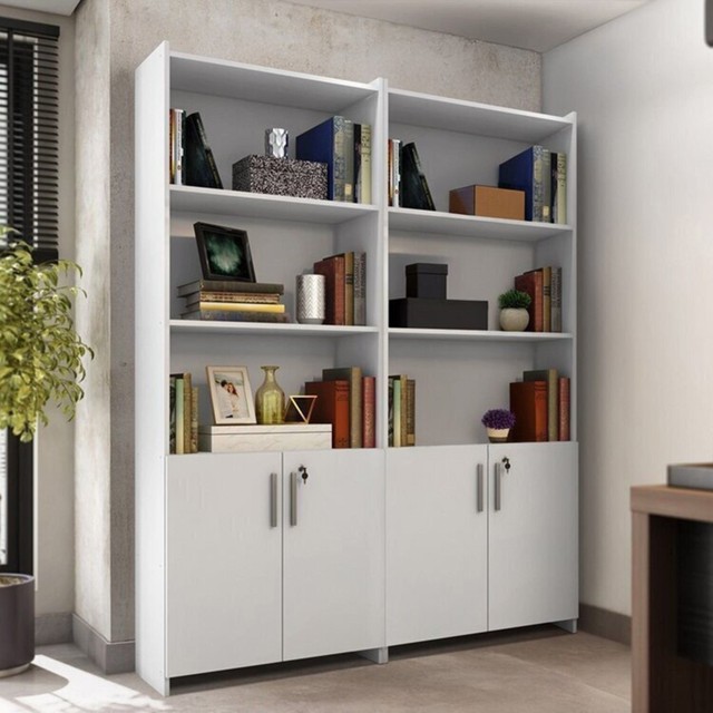 Kit com 2 Armários para Escritório Semi-Aberto 2 Portas com Chave Branco