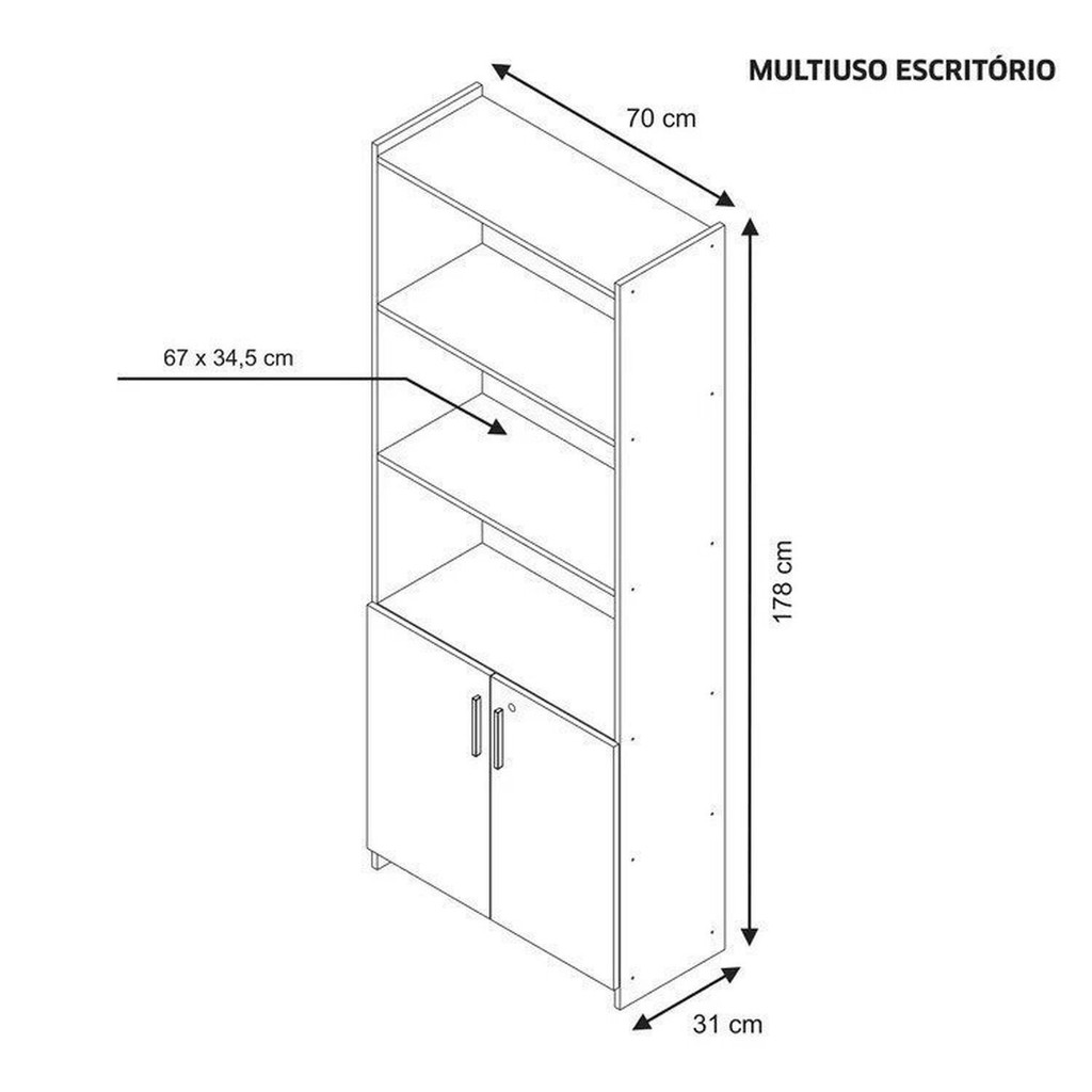 Otimize seu ambiente de trabalho ou estudo com o Kit de 2 Armários para Escritório. Versátil e elegante, ele oferece uma solução completa para organização, combinando prateleiras abertas para fácil acesso e um compartimento fechado para maior privacidade, mantendo tudo ao seu alcance de forma ordenada. - Design Inteligente: O formato semi-aberto dispõe de prateleiras superiores para livros, pastas e objetos decorativos, enquanto a base com portas duplas é perfeita para armazenar itens que exigem mais discrição. - Segurança para seus Pertences: O armário inferior conta com fechadura e chave, garantindo que seus documentos importantes, materiais de trabalho e objetos pessoais fiquem guardados em segurança. - Estrutura Firme e Durável: Produzido integralmente em chapa de 15 mm, cada armário oferece estabilidade e resistência para o uso contínuo, além de contar com puxadores discretos em alumínio que complementam o visual clean. - Dimensões para Qualquer Espaço: Cada peça do kit possui 178 cm de altura, 70 cm de largura e 31 cm de profundidade, um tamanho que se encaixa facilmente em escritórios e home offices sem comprometer a circulação. - Ampla Capacidade: As prateleiras foram projetadas para suportar até 5 kg cada, permitindo que você organize seus materiais de forma segura e eficiente. Acompanha: - 2 Armários multiuso para escritório Para uma compra certeira: Os itens decorativos das imagens não fazem parte do produto. Confirme se as medidas cabem no seu ambiente, considerando uma pequena folga de até 2 cm para manuseio. Estilo: Clássico Peso (kg): 60 Garantia: 03 Meses Altura (cm): 178 Acabamento: Acetinado Largura (cm): 70 Possui Pés: Não Possui Nichos: Não Possui Portas: Sim Tipo de Porta: Abrir Porta em Vidro: Não Possui Gavetas: Não Possui Rodízio: Não Suporta Até (kg): 5 Tipo de Gaveta: Não Possui Porta com chave: Sim Profundidade (cm): 31 Armário Suspenso: Não Altura do Conjunto: 178 Ambiente Principal: Escritório Formato do Armário: Retangular Material Principal: MDP Tamanho do Armário: Alto (Acima de 150cm) Largura do Conjunto: 70 Localização do Nicho: Sem Nicho Possui Mesa Retrátil: Não Número de Prateleiras: 4 Orientação do Armário: Vertical Prateleiras Reguláveis: Não Quantidade de Armários: 2 Tipo de Armário de Escritório: Semi-Fechado Marca: Espresso Móveis Cor: Branco PF Cor do Produto: Branco Cor Predominante: Branco Quantidade de Portas: 2 Portas Quantidade de Gavetas: Não Possui
