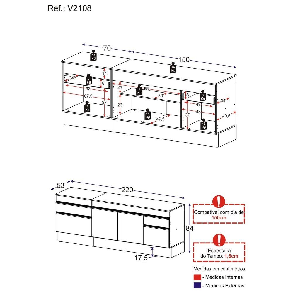 O Kit com 2 Balcões de Cozinha 150cm e 70cm com Rodapé Veneza Multimóveis V2108 é uma ótima solução para otimizar seu espaço e deixar a cozinha muito funcional. Com um excelente custo benefício e um amplo espaço interno, é produzido em MDP com acabamento acetinado (cerca de 20% de brilho), que garante maior durabilidade e resistência, possui rodapés, que deixam o ambiente mais estiloso, puxadores em ABS e tampo em MDP 15mm com pintura de alta resistência. O kit possui balcão para cooktop (o recorte do tampo deve ser realizado na hora da montagem conforme a medida do seu fogão) com 1 gaveta e 1 porta, além de gabinete para pia (compatível com pia de 150 cm) com 1 gaveta e 3 portas. *Não acompanha cooktop e pia de inox. Conteúdo da Embalagem: 1 (um) balcão com tampo 70cm 1 (um) balcão com tampo 150cm 1 (um) kit com rodapés Dimensões do produto montado: Altura: 84cm | Largura: 220cm | Profundidade: 53cm (balcão com tampo) *Você pode consultar as medidas internas na imagem técnica do produto. *As cores do produto podem sofrer variações de tonalidade de acordo com as configurações do seu dispositivo. Imagem meramente ilustrativa. Decoração e eletros não acompanham o produto. O produto será entregue desmontado e não disponibilizamos o serviço de montagem.