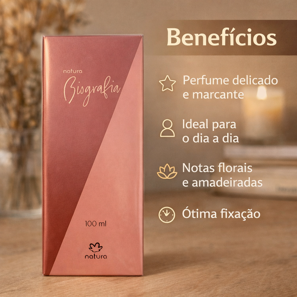 DESCRIÇÃO COMPLETA OTIMIZADA A Colônia Feminina Natura Biografia é uma fragrância elegante e sofisticada que traduz a essência feminina com delicadeza e personalidade. Com uma composição equilibrada e marcante, essa fragrância combina notas florais e suaves que criam um perfume envolvente, perfeito para mulheres que gostam de expressar sua identidade com elegância. Ideal para uso diário ou ocasiões especiais, Biografia Feminina transmite frescor, feminilidade e presença marcante. Benefícios Fragrância elegante e feminina Perfume leve e sofisticado para diversas ocasiões Aroma marcante sem ser excessivo Ideal para uso diário ou eventos especiais Produto da marca Natura reconhecida pela qualidade Características do produto Categoria: Colônia feminina Marca: Natura Linha: Biografia Volume: 100 ml Tipo de fragrância: Floral elegante Concentração: Colônia Indicação: Uso diário ou ocasiões especiais Notas da fragrância Notas de saída Toques frescos e leves que trazem sensação de frescor imediato. Notas de corpo Acordes florais femininos que trazem delicadeza e elegância. Notas de fundo Base suave e marcante que garante fixação agradável. Forma de uso Aplique a fragrância nas áreas de maior circulação sanguínea. Regiões indicadas: pescoço, pulsos e atrás das orelhas. Reaplique ao longo do dia se desejar intensificar o aroma. Indicação de público Mulheres que buscam uma fragrância elegante e versátil para: Uso diário Trabalho Encontros Eventos sociais Ocasiões especiais Envio imediato Produto disponível para envio imediato. Postagem rápida e segura. Garantia e segurança Produto revisado antes do envio para garantir qualidade e satisfação.