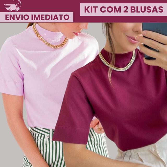 Kit com 2 Blusa Camiseta Feminina T-Shirt Gola Alta 100% Algodão