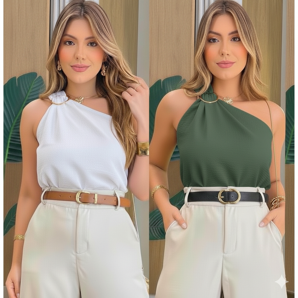 KIT Com 2 Blusas Feminina Obro Só Manga Mula Manca Fivela Orgânica Dourada Tecido Duna Elegante.