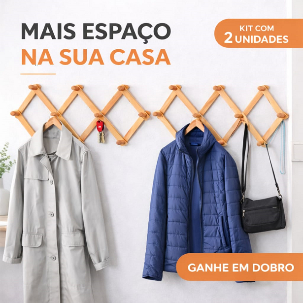 | Kit com 2 Cabideiros Sanfonado de Madeira Retratil com 10 Pinos Par... este produto | R$ 26,90 | 10% | 4.9/5 | 120 |