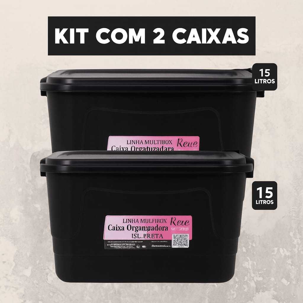 Kit Com 2 Caixas Plasticas Organizadoras 15 Litros Para Roupas Brinquedos Produtos Com Tampa Cor Preta Versatil Multiuso