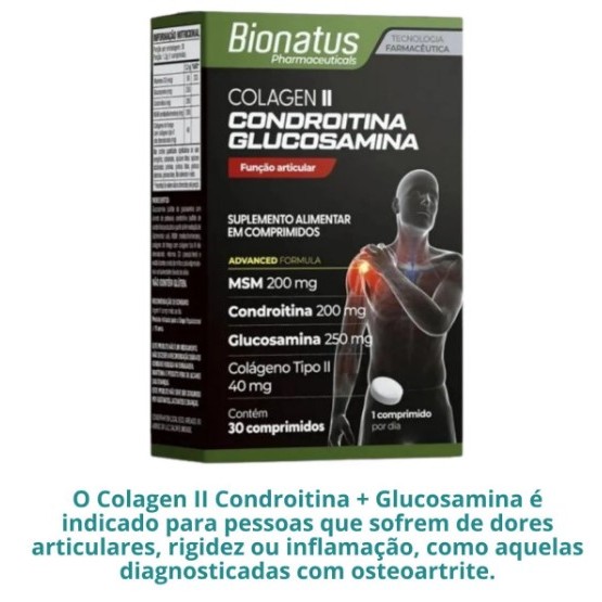 💊 Kit 2x Colágeno Tipo II + Condroitina + Glucosamina Bionatus – 30 comprimidos Cuide das suas articulações com quem entende de bem-estar! 💪🦵 🌿 Benefícios: ✨ Fortalece e regenera a cartilagem articular 🦴 Melhora a mobilidade e flexibilidade 🔥 Reduz inflamações e dores articulares 🏃 Ideal para idosos, atletas ou quem sofre com desgaste articular 💪 Fórmula poderosa com: Colágeno Tipo II não desnaturado Glucosamina Condroitina MSM (Metilsulfonilmetano) 📆 Modo de uso: 1 comprimido ao dia, de preferência com as refeições. 💚 Mais movimento, menos dor, mais qualidade de vida! 🌟