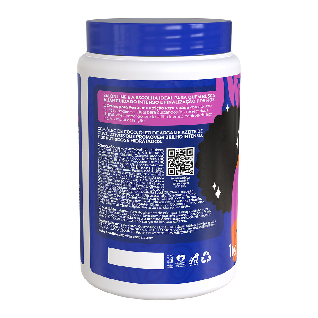 O Kit Salon Line conta com 2 Cremes para Pentear, um Reconstrução Intensa para reparar a fibra capilar e recuperar a força do cabelo, um Nutrição Reparadora para nutrição prolongada, controle do frizz e ação antirressecamento, além de 1 Máscara de Hidratação Bio-Reconstrução Fortalecedora para reposição das proteínas e regeneração da estrutura capilar. <>INDICAÇÕES$& Para quais tipos de cabelo? Todos os tipos de cabelos. Qual a indicação? Cabelos danificados, ressecados, quebradiços e desnutridos. Pode usar a partir de quantos anos? A partir de 12 anos. <>ATIVOS$& Quais os principais ativos? Creme para Pentear Reconstrução Intensa Óleo de coco: fortalece os fios e proporciona brilho e maciez extrema. Óleo de rícino: possui propriedades que restauram e hidratam os fios, além de manter o couro cabeludo saudável. Arginina: fortalece e repara os fios, além de atuar formando uma película protetora que sela as cutículas, diminuindo a quebra de cabelo, além de garantir brilho extremo. Creme para Pentear Nutrição Reparadora Óleo de coco: fortalece os fios e proporciona brilho e maciez extrema. Óleo de argan: forma uma película protetora que evita a perda de água natural dos fios. Além disso, promove hidratação e nutrição, reparando e fortalecendo os cabelos. Azeite de oliva orgânico: hidrata e dá brilho ao cabelo, além de nutrir e regenerar os fios. Máscara S.O.S Hidratação Bio-Reconstrução Fortalecedora Proteína do ovo: rico em proteína, vitaminas e minerais, o ovo fortalece e mantém os fios saudáveis, macios e brilhosos. Queratina: devolve a resistência e a elasticidade dos cabelos. Colágeno: proteína que ajuda na reposição proteica e na saúde dos fios. <>MODO DE USO$& Qual a melhor forma de usar? Creme para Pentear Reconstrução Intensa Aplique o Creme para Pentear no cabelo úmido e espalhe mecha a mecha, do comprimento às pontas. Desembarace com um pente de dentes largos e, em seguida, amasse de baixo para cima. Se quiser mais volume, não use próximo à raiz. Creme para Pentear Nutrição Reparadora Aplique o Creme para Pentear no cabelo úmido e espalhe mecha a mecha, do comprimento às pontas. Em seguida, desembarace com um pente de dentes largos e, depois, amasse de baixo para cima. Se quiser controle de volume, aplique na raiz. Máscara S.O.S Hidratação Bio-Reconstrução Fortalecedora Após lavar os cabelos, retire o excesso de água e aplique a máscara do comprimento até as pontas. Aguarde 3 minutos e enxágue. <>CARACTERÍSTICAS$& É produto vegano? Apenas a Máscara de Hidratação S.O.S Hidratação Bio-Reconstrução Fortalecedora não é vegana. É liberado? Os produtos não são liberados.