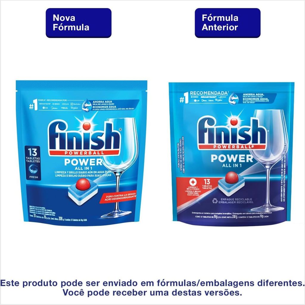Você está comprando 1 unidade do produto: Detergente Finish PowerBall All in One 13 Tabletes, marca: Finish. Finish Powerball All in one Max Tabletes é o seu detergente lava louças que oferece limpeza poderosa e brilho perfeito em um único tablete. Finish é a marca No1 em detergente para lava louças no mundo! É muito mais que um sabão lava louças, pois sua exclusiva tecnologia Powerball combinada com agentes secantes deixam sua louça limpa, brilhante e seca, sem necessidade de pré enxague. Vem pronto para usar, com o dispenser de sua máquina de lavar seco, é só colocar na máquina, sem retirar a película plástica, e deixar a mágica acontecer. Dispensa até mesmo a pré-lavagem. Finish Powerball All in one Max Tabletes amolece os restos de comida, elimina resíduos e manchas, e a ação efervescente do powerball libera bolhas com agentes de limpeza e remove até mesmo a sujeira pesada. O resultado são louças, talheres, copos e até panelas brilhantes! Finish Powerball All in one Max, limpeza poderosa, brilho perfeito! O mais recomendadoProduto de alta tecnologia, que além de eliminar a sujeira sem agredir louças e talheres, oferece o melhor custo-benefício e resultados da categoria. Finish é a marca No1 em recomendação pelos principais fabricantes de Máquinas de Lava Louça*. Para Finish Powerball All in one Max, sinônimo de qualidade e confiança, missão dada é missão cumprida. Invista em qualidade de vida: Sua vida está em constante mudança e você faz questão de preparar a sua refeição em casa, mas não quer se preocupar com a pilha de louça suja. Finish Powerball All in One Max te ajuda nesta missão! Usar lava louças e Finish é prático e eficiente, remove gordura e até as sujeiras mais difíceis, sembagunça, sem ressecar as mãos, e o melhor, com economia de água**. Ele também cuida e protege a louça, aproveite seu tempo com o que mais ama e deixe a louça por conta de Finish Powerball All In One Max Tabletes.E, para uma experiência mais completa, experimente Finish Secante para louças mais secas e brilhantes! Qualidade e vanguarda: Há mais de 60 anos na vanguarda de produtos para lava louças automáticas e comercializada em mais de 70 países, a Finish realiza constantes pesquisas para oferecer sempre o melhor para seus consumidores. O resultado são louças perfeitamente limpas, secas e brilhantes. Marca: Finish.