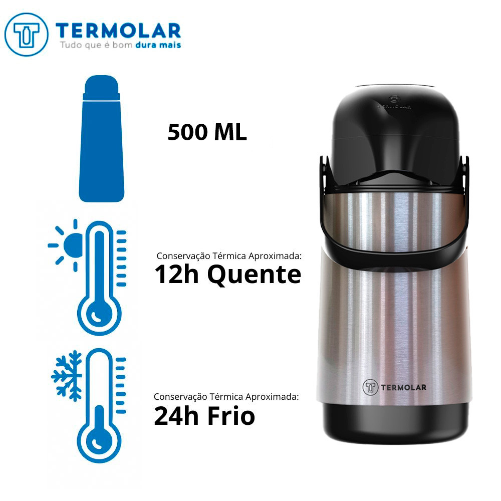 KIT – 2x Garrafa Térmica Termolar Lúmina 500ml Inox – Bomba de Pressão O que está adquirindo 02 Garrafas Térmicas Termolar Lúmina 500ml Aço Inox – Bomba de Pressão Descrição do Produto Kit com duas garrafas térmicas Termolar Lúmina 500ml, desenvolvido para quem busca praticidade e conservação térmica no dia a dia. Cada garrafa conta com sistema de bomba de pressão que não pinga, corpo externo em inox com acabamento que evita marcas de dedo e excelente desempenho para manter líquidos quentes ou frios por longos períodos. Ideal para uso residencial, corporativo ou em ambientes compartilhados, oferecendo facilidade ao servir e organização no consumo diário de bebidas. Especificações Técnicas Garrafa Térmica Termolar Lúmina 500ml (cada unidade) Referência: 151 Código: 52999 Modelo: 9752E Marca: Termolar Capacidade: 500 ml (0,5 L) Conservação térmica quente: até 12 horas Conservação térmica fria: até 24 horas Isolamento térmico: Ampola de vidro Sistema de servir: Bomba de pressão Material externo: Aço inox Livre de BPA: Sim Material atóxico: Sim Dimensões aproximadas (AxLxC): 42 x 15 x 16 cm Aplicações Recomendadas Conservação de bebidas quentes como café, chá e leite Conservação de bebidas frias como água e sucos Uso doméstico, corporativo, escritórios e salas de reunião Apoio para rotinas diárias, eventos e ambientes compartilhados Manuseio e Manutenção Utilize sempre na posição vertical, sem inclinar ou deitar Evite choques térmicos alternando líquidos quentes e frios Para limpeza interna, utilize bicarbonato de sódio com água quente conforme orientação do fabricante Limpeza externa com pano úmido e sabão neutro Não utilizar abrasivos, produtos com cloro, micro-ondas ou lava-louças SKU do Kit: KIT2931 Garantia: 90 dias para componentes plásticos, conforme política do fabricante