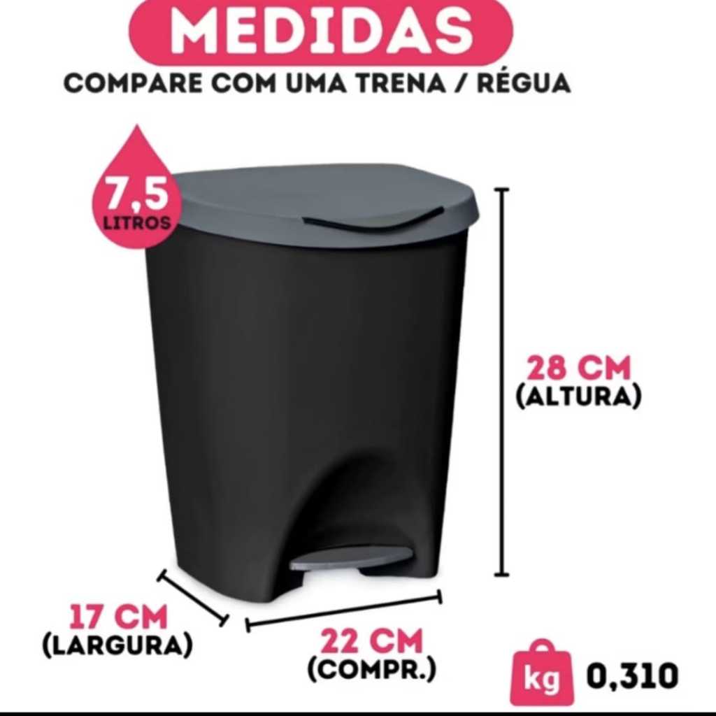 KIT COM 2 Lixeira com Pedal 7,5 E 15 Litros Premium Gourmet Escritório Cozinha Banheiro Quarto - Usual Utilidades Indispensáveis, as lixeiras são importantes para manter o ambiente limpo e adicionar tudo que precisa ser descartado, sem comprometer a higiene e organização do espaço. Ideal para sua cozinha, banheiro ou escritório, essa lixeira possui diversas cores para se adequar a qualquer estilo de ambiente. O plástico do corpo possui acabamento polido o que torna essa lixeira incomparável quando o assunto é beleza e durabilidade. A tampa evita eventual risco de contaminação.