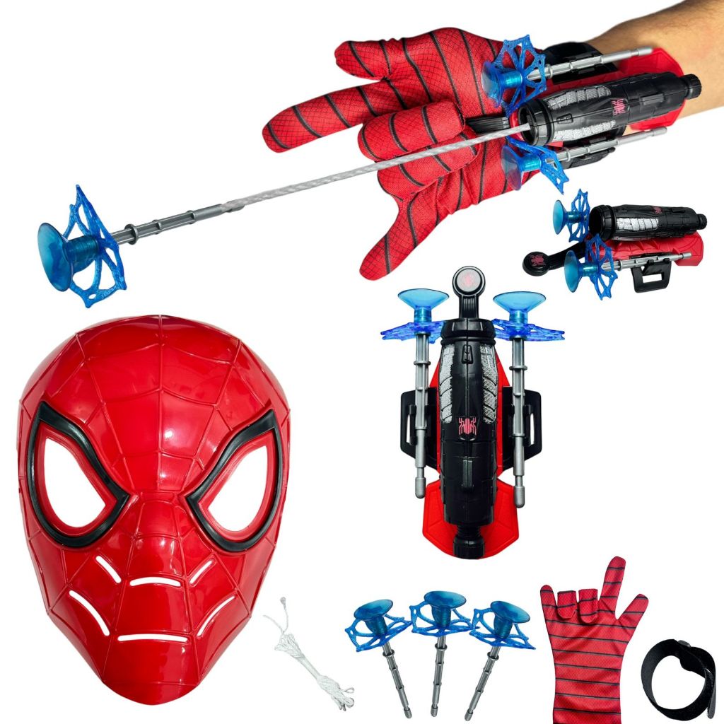 Kit Com 2 Luva Com Lançador De Teia Do Homen Aranha + Mascara Spider Man Conjunto Super Herói