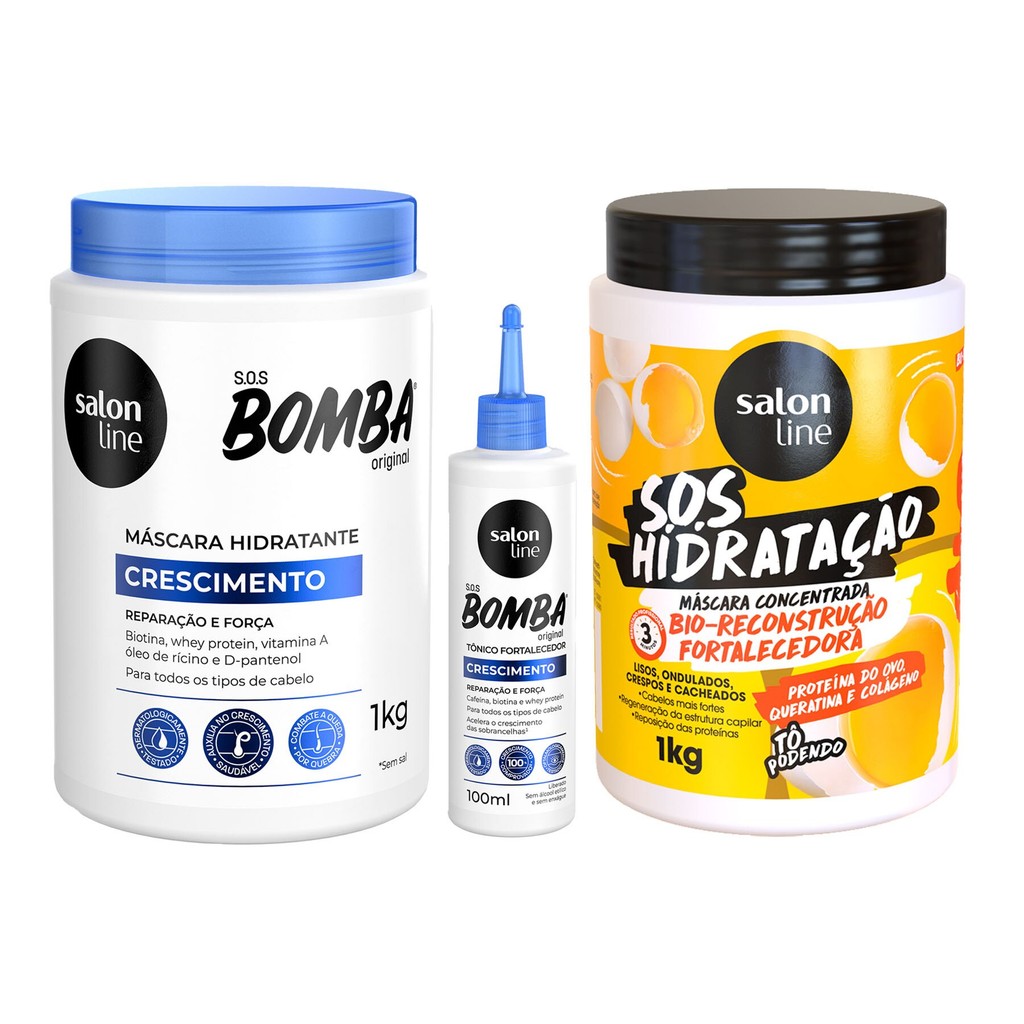 O Kit Salon Line conta com 1 Tônico Fortalecedor da linha S.O.S Bomba Crescimento para um crescimento saudável dos fios, 1 Máscara de Hidratação da linha S.O.S Bomba para restaurar as fibras capilares e auxiliar no crescimento saudável e 1 Máscara de Hidratação Bio-Reconstrução Fortalecedora para mais hidratação, tratamento e regeneração dos fios. <>INDICAÇÕES$& Para quais tipos de cabelo? Todos os tipos de cabelos. Qual a indicação? Cabelos danificados, fracos, ressecados, quebradiços e desidratados. Pode usar a partir de quantos anos? A partir de 12 anos. <>ATIVOS$& Quais os principais ativos? Tônico Fortalecedor S.O.S Bomba Crescimento Creatina: restaura a fibra capilar. Aminoácidos: ajuda na reconstrução e fortalecimento dos cabelos. Broto de Bambu: revitaliza e hidrata a fibra capilar. Máscara de Hidratação S.O.S Bomba Original Whey protein: restaura a fibra capilar danificada. Vitamina A: fortalece os fios e auxilia no crescimento saudável. D-pantenol: hidrata e melhora a textura da fibra, combatendo as pontas duplas. Biotina: ajuda a prevenir a queda, estimula o crescimento e fortalece os fios. Óleo de rícino: hidrata, combate a queda por quebra, fortalece e recupera profundamente os fios. Máscara S.O.S Hidratação Bio-Reconstrução Fortalecedora Proteína do ovo: rico em proteína, vitaminas e minerais, o ovo fortalece e mantém os fios saudáveis, macios e brilhosos. Queratina: devolve a resistência e a elasticidade dos cabelos. Colágeno: proteína que ajuda na reposição proteica e na saúde dos fios. <>MODO DE USO$& Qual a melhor forma de usar? Tônico Fortalecedor S.O.S Bomba Crescimento Depois de lavar o cabelo, aplique o Tônico no couro cabeludo e faça massagens circulares. Não precisa enxaguar. Máscara de Hidratação S.O.S Bomba Original e Máscara S.O.S Hidratação Bio-Reconstrução Fortalecedora Com o cabelo molhado, aplique qualquer uma das máscaras de hidratação mecha a mecha, enluvando os fios do comprimento às pontas. Deixe agir de 3 a 5 minutos e enxágue. <>CARACTERÍSTICAS$& É produto vegano? Os produtos não são veganos. É liberado? Apenas o Tônico Fortalecedor S.O.S Bomba Antiqueda é liberado.