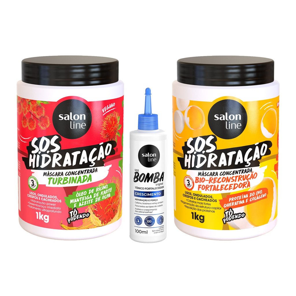 O Kit Salon Line conta com 2 Máscaras de Hidratação da linha S.O.S Hidratação, sendo 1 Hidratação Bio-Reconstrução Fortalecedora e 1 Hidratação Turbinada para mais hidratação, tratamento e regeneração dos fios, além de 1 Tônico Fortalecedor da linha S.O.S Bomba Antiqueda para um crescimento saudável dos fios. <>INDICAÇÕES$& Para quais tipos de cabelo? Todos os tipos de cabelos. Qual a indicação? Cabelos danificados, fracos, ressecados, quebradiços e sem brilho. Pode usar a partir de quantos anos? A partir de 12 anos. <>ATIVOS$& Quais os principais ativos? Tônico Fortalecedor S.O.S Bomba Antiqueda Creatina: restaura a fibra capilar. Aminoácidos: ajuda na reconstrução e fortalecimento dos cabelos. Broto de Bambu: revitaliza e hidrata a fibra capilar. Máscara S.O.S Hidratação Turbinada Manteiga de karité: hidrata e nutre profundamente o cabelo. Óleo de rícino: fortalece e nutre os fios danificados. Azeite de oliva: garante força e hidratação intensa. Máscara S.O.S Hidratação Bio-Reconstrução Fortalecedora Proteína do ovo: rico em proteína, vitaminas e minerais, o ovo fortalece e mantém os fios saudáveis, macios e brilhosos. Queratina: devolve a resistência e a elasticidade dos cabelos. Colágeno: proteína que ajuda na reposição proteica e na saúde dos fios. <>MODO DE USO$& Qual a melhor forma de usar? Tônico Fortalecedor S.O.S Bomba Antiqueda Depois de lavar o cabelo, aplique o Tônico no couro cabeludo e faça massagens circulares. Não precisa enxaguar. Máscara S.O.S Hidratação Turbinada Após lavar os cabelos, retire o excesso de água e aplique a máscara do comprimento até as pontas. Aguarde 3 minutos e enxágue. Máscara S.O.S Hidratação Bio-Reconstrução Fortalecedora Após lavar os cabelos, retire o excesso de água e aplique a máscara do comprimento até as pontas. Aguarde 3 minutos e enxágue. <>CARACTERÍSTICAS$& É produto vegano? Apenas a Máscara S.O.S Hidratação Turbinada é vegana. É liberado? Apenas o Tônico Fortalecedor S.O.S Bomba Antiqueda é liberado.