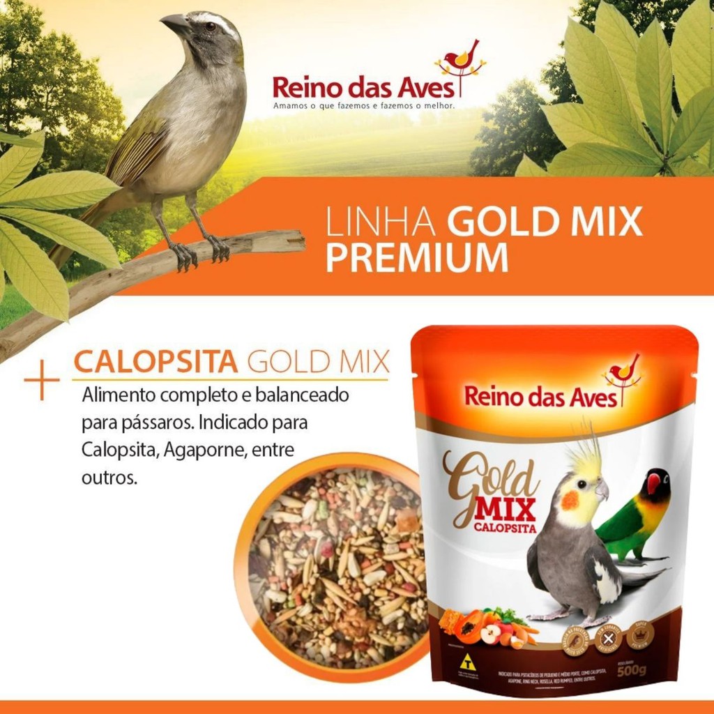 CONTÉM NO KIT: 2 Calopsita Gold Mix 500g cada - Reino das Aves Alimento completo e balanceado para psitacídeos de pequeno e médio porte, como calopsita, agapornis, ring neck, rosela, red rumped, entre outros. Sem adição de corantes artificiais. COMPOSIÇÃO BÁSICA: Alpiste. Painço Nacional, Painço Vermelho, Painço Preto, Maçã Desidratada (Mín. 1,0%), Laranja e Mamão Desidratado ( Mín. 2,0%), Cenoura Desidratada (Mín.0,1%), Arroz em Casca, Aveia em Casca, Girassol Muído, Trigo Mourisco, Cártamo, Sorgo Vermelho, Milho Moído, Quirera de Arroz, Farelo de Soja, Farelo de Glúten de Milho 60, Gérmen de Milho Integral, Beterraba em Pó, Ovo Integral Desidratado, Extrato de Própolis, Cloreto de Sódio, Farinha de Ostras, Sacarina Sódica, Neoespiridina, Dióxido se Silicio, MOS (Mananoligosacarídeos), Adsorvente de Micotoxinas, Aditivo Antifúngico ( Propionato de Cálcio), Aditivo Antioxidante (B.H.T).