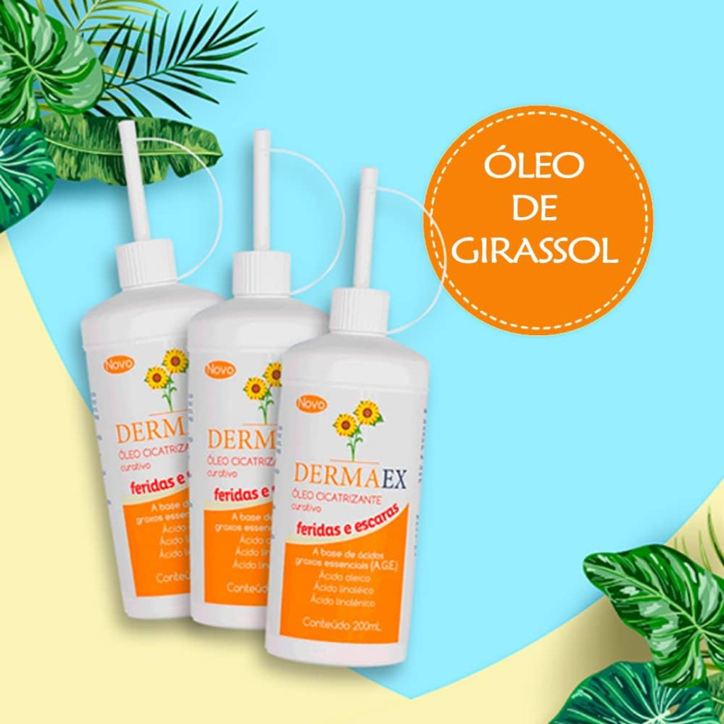 Kit com 2 Óleos de Girassol Dermaex 200ml - Óleo Cicatrizante O Óleo de Girassol Dermaex é uma solução natural e eficaz para promover a cicatrização e hidratação da pele. Rico em vitamina E e ácidos graxos essenciais, este óleo ajuda na regeneração da pele, acelerando o processo de cicatrização de feridas, queimaduras e outras irritações cutâneas. Seu uso contínuo proporciona uma pele macia, nutrida e saudável. Este kit contém 2 frascos de 200ml, ideal para quem busca cuidar da pele com economia e praticidade. Destaques do produto: Cicatrização rápida: Ajuda a restaurar a pele danificada e a proteger contra infecções; Hidratação intensa: Mantém a pele profundamente hidratada e suave; Rico em antioxidantes: A vitamina E combate os radicais livres, promovendo a saúde da pele; Uso versátil: Pode ser utilizado em feridas, queimaduras, irritações e para hidratação diária; Fácil absorção: Textura leve, que penetra rapidamente na pele sem deixá-la oleosa. Com o Óleo de Girassol Dermaex, você garante cuidados especiais para a pele, com propriedades naturais que ajudam na regeneração e cicatrização de forma eficaz.