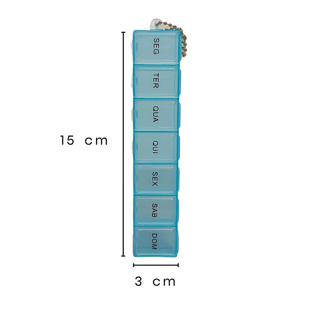 O Porta Comprimidos Semanal concentra todas as doses em um só lugar, facilitando a organização e seguindo à risca seus tratamentos. Prático, pode ser levado para todos os lugares. Para quem faz uso contínuo de medicação, sabe que é necessário, muito controle para não esquecer as quantidades e os dias a serem tomados! Especificações Técnicas: - 100% Importado e de Alta Qualidade; - Porta comprimido semanal; - Permite o controle diário de uma vez por dia; - Prático e organizado; - Controle exato das medicações; - Composição: ABS; - Cor: Azul, rosa e transparente; - Dimensões: 15 x 3,0 x 2,0 cm