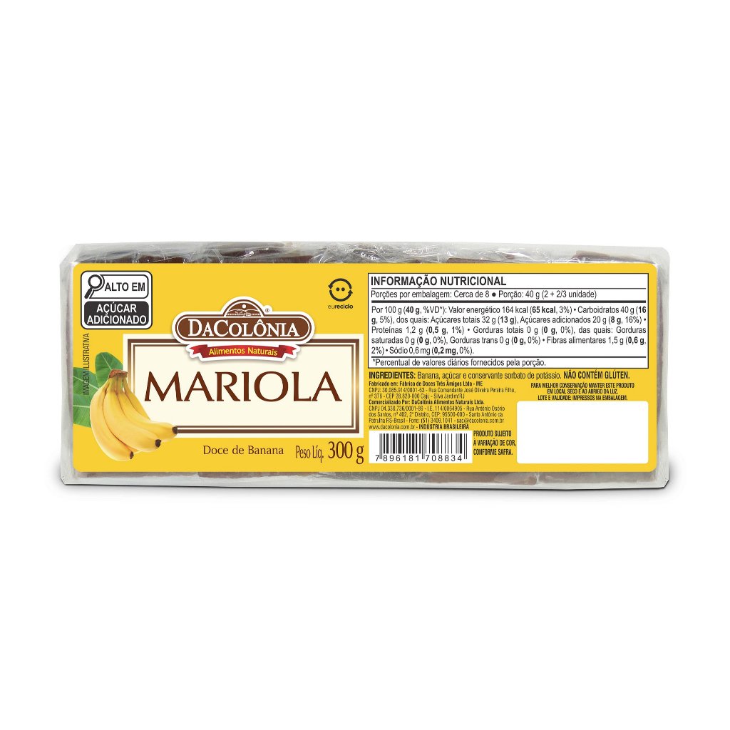 Kit com 2 Pacotes de Mariola Doce de Banana 300g DaColônia Apresentação: cada pacote contém 300g com aproximadamente 20 unidades podendo variar a quantidade. *** NÃO CONTÉM GLÚTEN. Ingredientes: Banana, açúcar e conservante sorbato de potássio. ENVIO IMEDIATO, COMPRE COM SEGURANÇA Toda compra realizada é processada em ambiente seguro. EMBALAGEM SEGURA O produto é embalado de forma absolutamente segura para evitar qualquer dano durante o transporte. ENTREGA DA MERCADORIA A entrega pode ser acompanhada diretamente no site/aplicativo onde foi feita a compra. Todo produto postado possui código de rastreamento.