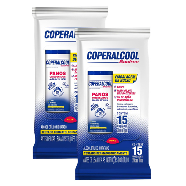 Kit com 2 Panos Lenços Umedecidos Coperalcool Bacfree 70°INPM Embalagem de Bolso Clássico 15 Panos