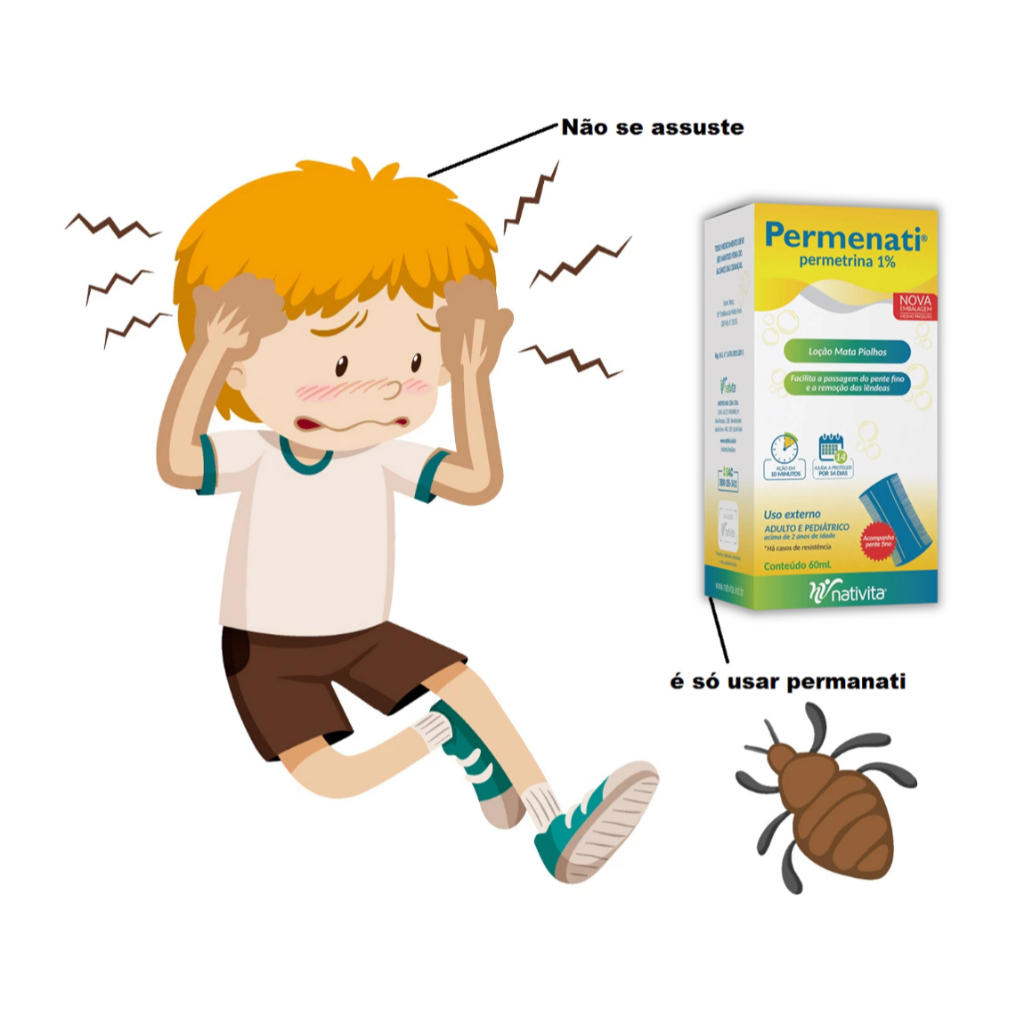 Este Kit contém 2 frascos de 60mL de Permenat (Permetrina 1%) Descrição: Permenati 1% é uma solução tópica contendo permetrina a 1%, indicado para infestação de piolhos e lêndias. A permetrina é um inseticida que age paralisando os piolhos, eliminando-os. Modo de uso: -Lavar o cabelo com xampu de sua preferência, enxaguar e enxugar com a toalha. - Agitar bem o frasco de Permenati e aplicar nos cabelos ainda úmidos, cobrindo todo o courocabeludo, esfregando abundantemente em toda a extensão, principalmente atrás das orelhas e na nuca, onde os piolhos e as lêndeas se concentram mais. Assegurar de que todo o couro cabeludo ficou bem encharcado para não afetar o tratamento. - Deixar o produto agir por 10 minutos. - Passar o pente fino para a remoção dos piolhos e das lêndeas. - Enxaguar o cabelo com água morna e enxugar com a toalha. A quantidade de Permenati necessária depende do volume e tamanho dos cabelos, podendo ser necessário usar o frasco inteiro, e em alguns casos de cabelos mais longos pode ser necessário mais de um frasco. O efeito completo poderá ocorrer dentro de algumas horas. É provável encontrar alguns piolhos vivos logo após o uso. Esperar algumas horas antes de usar o pente fino de novo. Em geral uma única aplicação é suficiente. Se ainda houver piolhos e lêndea após 7 dias da primeira aplicação, aplicar o produto pela segunda vez. Após 7 dias da segunda aplicação caso o paciente ainda encontre algum piolho vivo, deverá procurar o médico. É importante assegurar que o tratamento foi realizado corretamente, para que o produto possa ter efeito desejado.