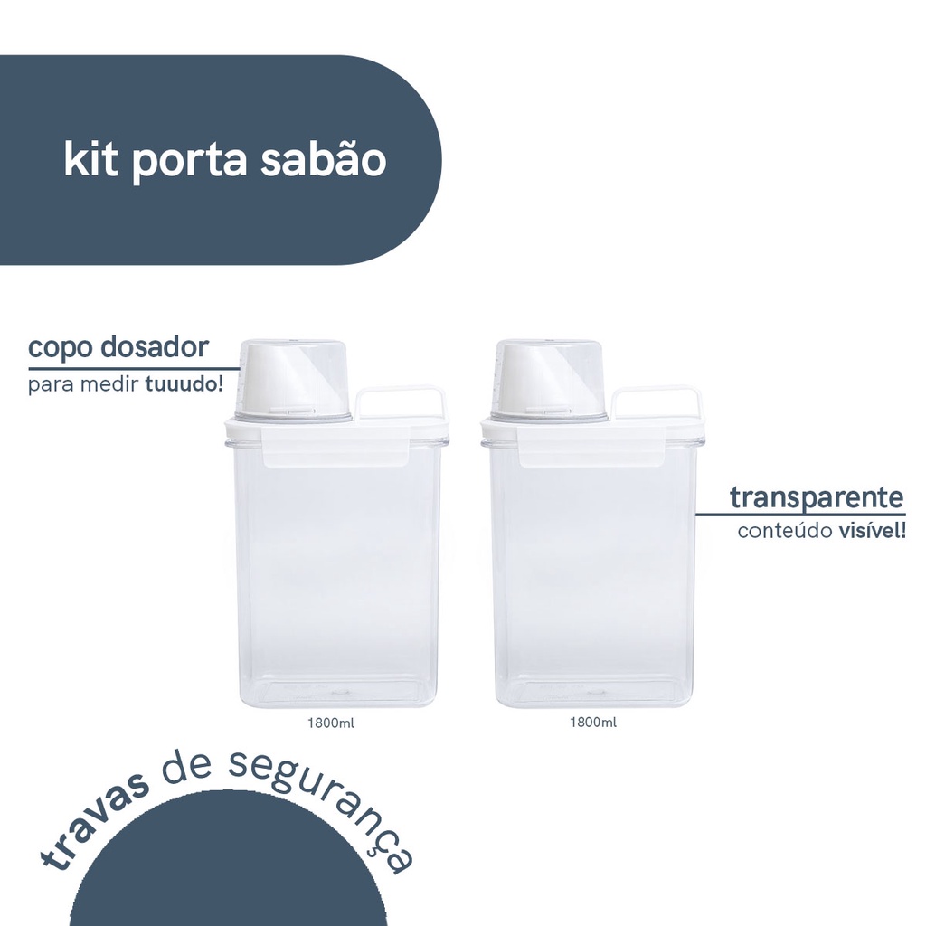 "conheça o kit com 2 porta sabão em pó 1,8L com copo dosador e travas da oikos! ideais para lavanderia, possuem copo dosador para medir as quantidades exatas, têm alça para facilitar o transporte e travas para evitar vazamentos! armazene sabão em pó, líquido, amaciante, detergente e o que você quiser. dica para todos #oikolovers: eles são suuuper multiuso! você pode utilizar até na cozinha para colocar e medir grãos, temperos, aveia, açúcar, café e outros alimentos. são de plástico e possuem aneis de silicone. podem ser lavados na água corrente com esponja e sabão neutro. não podem ir na lava louças. leve praticidade e modernidade para sua casa! o kit contém: 2 porta sabão em pó 1,8L com dosador e travas comprimento: 13cm | largura: 8cm | altura: 24cm"