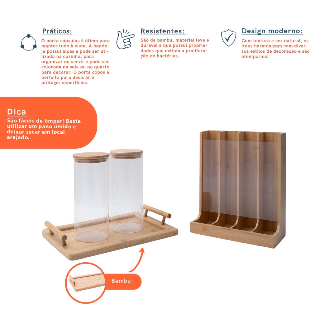 Conheça o Kit com 2 potes com tampa de bambu 1,6L, porta cápsulas e bandeja retangular com alças da OIKOS. Resistentes, práticos e com design moderno, são itens funcionais e decorativos. Os potes são bons para armazenar tudo que precisar, além de serem versáteis, caem bem da cozinha ao quarto. O porta capsúlas é ótimo para manter tudo sempre à vista. A bandeja possui alças e pode ser utilizada na cozinha, para organizar ou servir e pode ser colocada na sala ou no quarto para harmonizar a decoração. Os potes são de vidro e bambu. O porta cápsulas é de bambu e acrílico, a bandeja é de bambu. Para limpar, basta utilizar um pano úmido, secar em seguida e deixar em local arejado. Leve qualidade e modernidade para sua casa! O kit contém: 2 potes com tampa de bambu 1,6L 1 Porta cápsulas 1 Bandeja retangular com alças