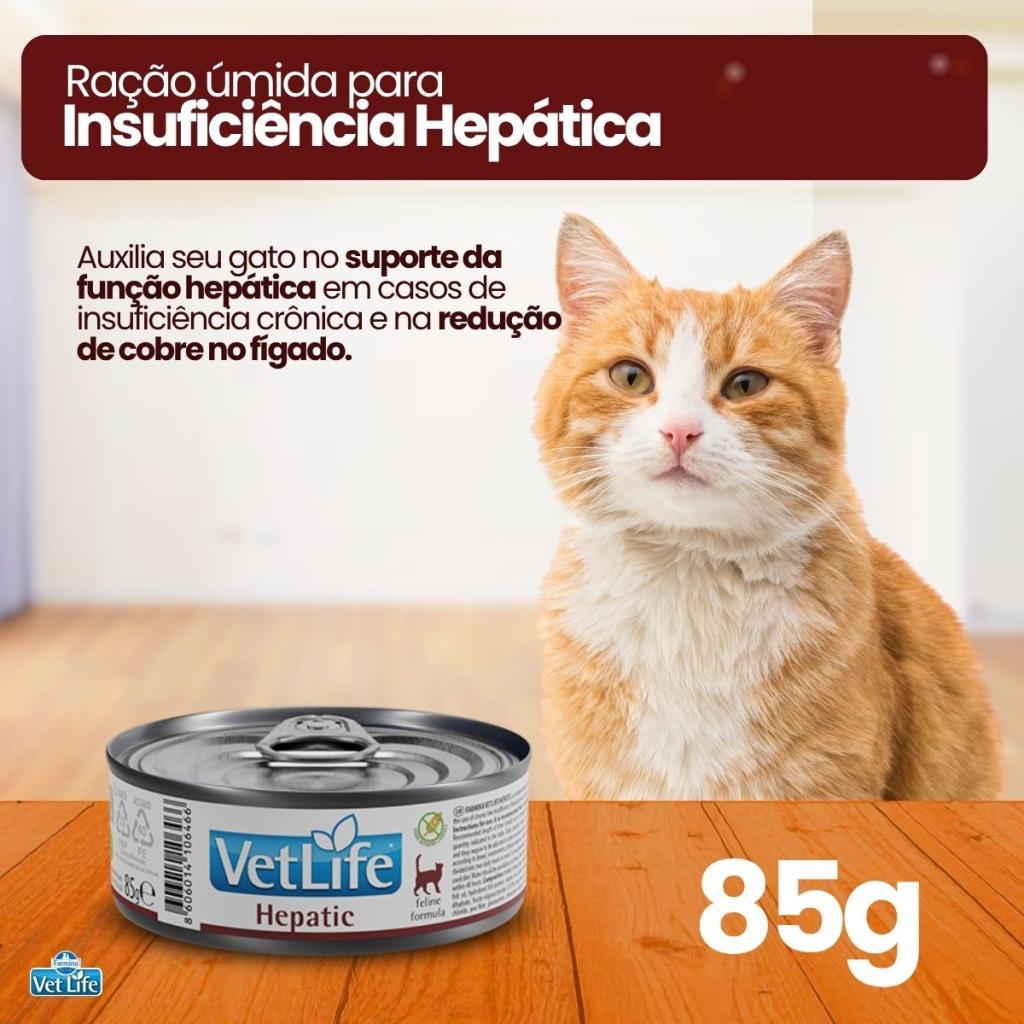 Ração Úmida Vet Life Hepatic Gatos - 85g Alimento coadjuvante úmido indicado para gatos, formulado para auxiliar no suporte da função hepática em casos de insuficiência hepática crônica. Possui nível moderado de proteína, com fontes selecionadas e de alta digestibilidade. Restrições e recomendações: Contraindicado em casos de linfangectasia, hiperlipidemia e pancreatites hiperlipidêmicas. Composição básica: Carne de frango, proteína hidrolisada de peixe, ovo cozido, batata doce, grão de quinoa, óleo de peixe, óleo de frango, carbonato de cálcio, cloreto de potássio, sulfato de cálcio dihidratado, prebióticos (FOS e MOS), taurina, DL-metionina, L-carnitina, cloreto de sódio, fibra de ervilha, sulfato de glicosamina, sulfato de condroitina, extrato de yucca, levedura seca de cervejaria, vitaminas (A, D3, E) e minerais quelatados. Níveis de garantia (por kg): Umidade (máx.) 80%; proteína bruta (mín.) 6%; extrato etéreo (mín.) 3,8%; matéria fibrosa (máx.) 0,5%; matéria mineral (máx.) 2,3%; cálcio (mín.) 0,1% / (máx.) 0,3%; fósforo (mín.) 0,1%; sódio (mín.) 0,1%; potássio (mín.) 0,2%. Nutrientes funcionais: Metionina (mín.) 800 mg/kg; L-carnitina (mín.) 40 mg/kg; taurina (mín.) 1.300 mg/kg; MOS (mín.) 1.000 mg/kg; FOS (mín.) 1.500 mg/kg; glucosamina (mín.) 800 mg/kg; condroitina (mín.) 800 mg/kg; ômega 6 (mín.) 8.000 mg/kg; ômega 3 (mín.) 3.500 mg/kg; EPA (mín.) 1.000 mg/kg; DHA (mín.) 1.000 mg/kg. Energia metabolizável: 979 kcal/kg Enriquecimento por kg: Vitamina A 5.620 UI; vitamina D3 225 UI; vitamina E 205 UI; zinco 34,8 mg; manganês 15,4 mg; ferro 10,8 mg; iodo 0,46 mg.