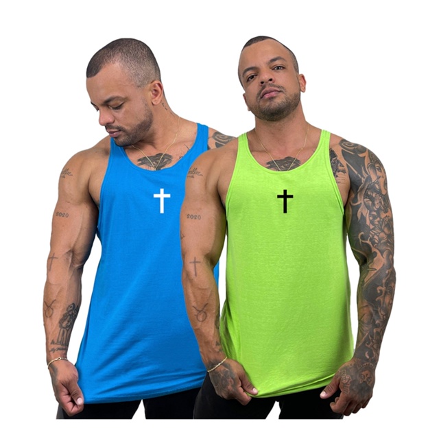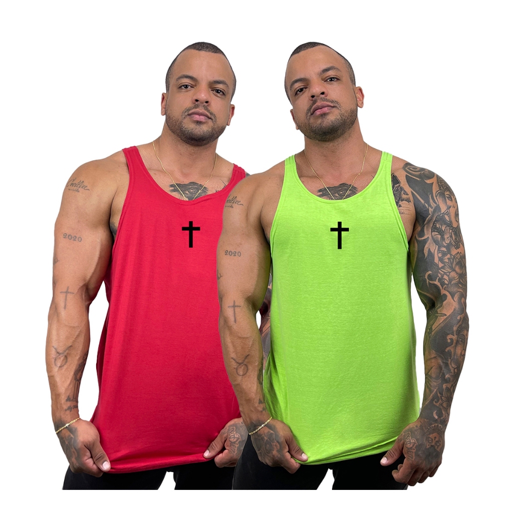 Kit com 2 Regatas Cavada Masculina em várias cores Estampa Cruz Verde Neon + Cores - Bombey