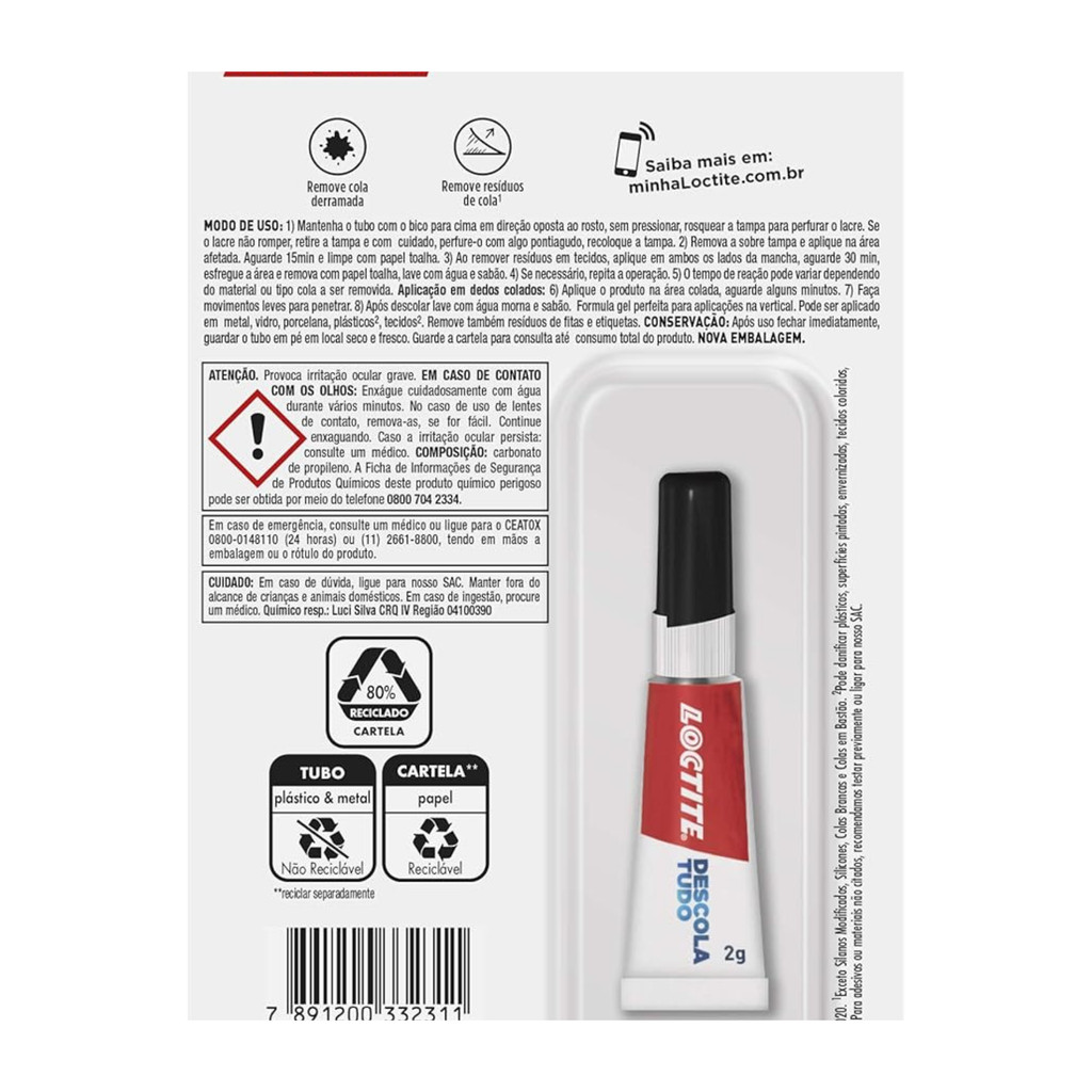 Kit com 2 Descola tudoLoctite Descola Tudo: O removedor de cola universal para resíduos de cianoacrilato e muito mais! O Loctite Descola Tudo é a solução definitiva para remover resíduos de todas as colas instantâneas à base de cianoacrilato, incluindo as principais marcas do mercado, como Super Bonder, Tekbond, Trheebond, 3M Super Cola, Scotch-Weld e outras, além de fitas adesivas e etiquetas. Sua fórmula em gel, que não escorre, permite a aplicação precisa em diversas superfícies, até mesmo verticais, sem o risco de escorrimento indesejado. Principais benefícios: Remoção universal: Remove resíduos de colas instantâneas à base de cianoacrilato de todas as marcas, fitas adesivas e etiquetas, de diversas superfícies como metal, vidro, porcelana, plástico* e tecido*. Correção de colagens: Ideal para corrigir pequenas colagens defeituosas e descolar dedos acidentalmente grudados. Fórmula em gel: Permite aplicação precisa e sem desperdícios, mesmo em superfícies verticais. Versatilidade: Ideal para projetos de reparo, customização e limpeza em geral. Informações adicionais: Cor: Transparente Formato: 1x2g Marca: Henkel Modo de uso: Aplique o produto na área afetada e aguarde alguns minutos. Remova os resíduos com um pano ou papel toalha. Para descolar dedos grudados, aplique o produto na área colada, faça movimentos leves e circulares para que o produto penetre. Após a descolagem lave a área com água morna e sabão. Em tecidos, aplique o produto em ambos os lados da mancha, aguarde 30 minutos, esfregue a área e remova com papel toalha. Lave com água e sabão. Precauções: *Pode danificar plásticos, superfícies pintadas, envernizadas, tecidos coloridos, sintéticos e/ou delicados. Recomenda-se testar em uma área discreta antes da aplicação. Mantenha fora do alcance de crianças. Com o Loctite Descola Tudo, você terá um produto versátil e eficiente para remover colas e resíduos indesejados, facilitando seus projetos de reparo e limpeza.