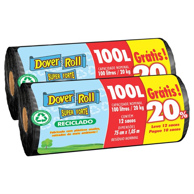 Kit com 2 Saco Para Lixo Super Forte Reciclado 100L 10un + 20% - Dover Roll