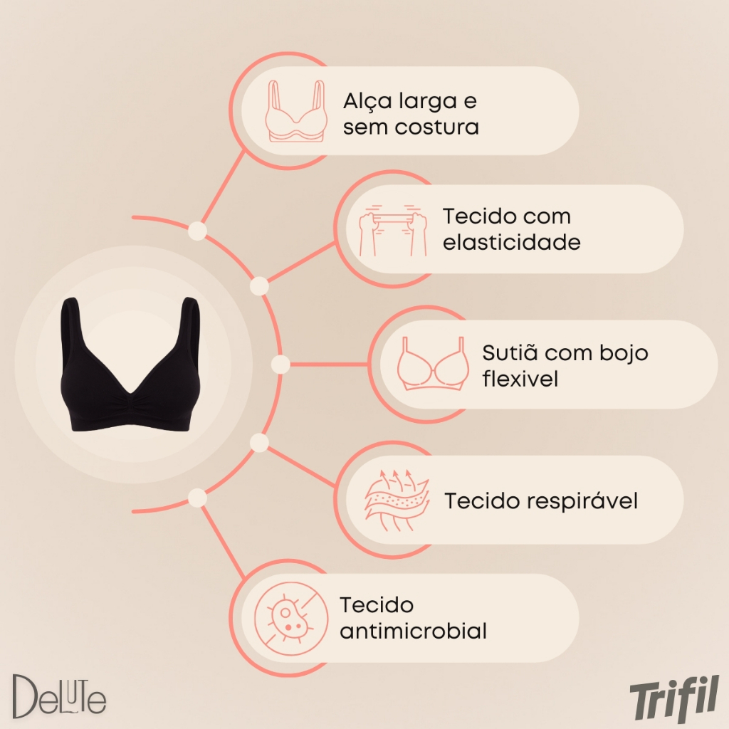 Confeccionado em microfibra macia, leve e extremamente confortável. Proporciona alta respirabilidade, durabilidade, rápida secagem e melhor absorção da umidade. Sutiã estilo top, sem aros, com bojo triangular moldado em espuma, oferecendo maior conforto e perfeito caimento. Sub busto com elástico embutido para ajuste perfeito. Decote com acabamento em viés. Centro do decote com drapeado anatômico. Laterais largas para maior sustentação. Alças largas sem regulagem. Indicado para a pratica de esporte e durante o período de amamentação. Top com bojo triangulo sem aro; Laterais mais largas que emagrecem; Bainha sem costura, não aperta e não marca; Alças largas que proporcionam mais suporte e sustentação e não marcam os ombros; Indicado para pratica de esportes. Composição: 98% Poliamida e 02% Elastano. Forro: 100% Poliéster.
