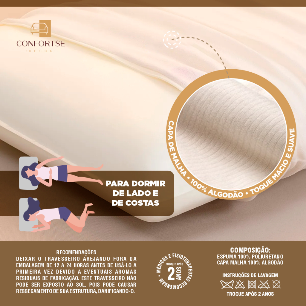 Desfrute de pausas agradáveis com o seu Travesseiro NASA Viscoelástico Confortse. Seu desenho efetivo garantirá um sono repousante e confortável. Versatilidade e excelência Graças ao seu sistema inteligente, ele se adapta à posição do pescoço e da cabeça, permitindo que você alivie a dor, reduza a fadiga e melhore progressivamente a qualidade do seu sono. Além disso, com sua memória embutida, você não terá que se preocupar com o seu travesseiro sendo marcado com a forma do seu corpo ou pescoço, pois logo após você se levantar, voltará ao seu estado original. Projetado para o seu conforto Feito de espuma visco elástica, este travesseiro lhe dará firmeza e solidez quando você dorme. Seu material é caracterizado por ser resistente: oferece um formato auto adaptável e anatômico, ideal para um relaxamento completo e satisfatório. Proteção e cuidados Graças ao seu material hipoalérgico, você poderá dormir tranquilo e evitar alergias ou complicações de saúde. Este produto lhe dará ótima qualidade no seu relaxamento diário. Para Dormir De Lado e De Costas. Recomendações: Deixar o travesseiro arejado fora da embalagem de 12 a 24 horas antes de usá-lo a primeira vez devido a eventuais aromas residuais de fabricação. Este travesseiro não pode ser exposto ao sol. Pois pode causar ressecamento de sua estrutura, danificando-o. Composição: Espuma 100% poliuretano. Capa de malha 100% algodão.