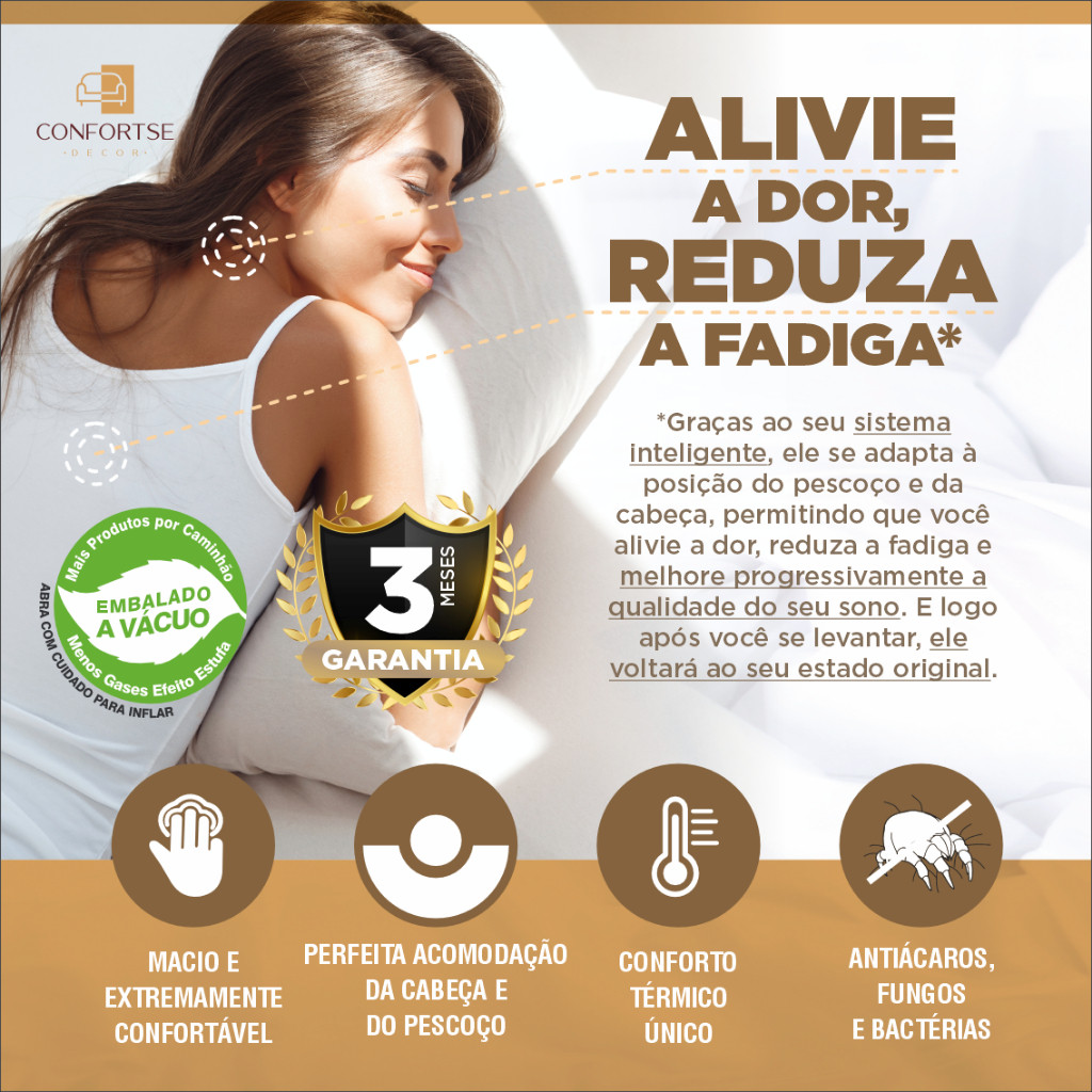 Desfrute de pausas agradáveis com o seu Travesseiro NASA Viscoelástico Confortse. Seu desenho efetivo garantirá um sono repousante e confortável. Versatilidade e excelência Graças ao seu sistema inteligente, ele se adapta à posição do pescoço e da cabeça, permitindo que você alivie a dor, reduza a fadiga e melhore progressivamente a qualidade do seu sono. Além disso, com sua memória embutida, você não terá que se preocupar com o seu travesseiro sendo marcado com a forma do seu corpo ou pescoço, pois logo após você se levantar, voltará ao seu estado original. Projetado para o seu conforto Feito de espuma visco elástica, este travesseiro lhe dará firmeza e solidez quando você dorme. Seu material é caracterizado por ser resistente: oferece um formato auto adaptável e anatômico, ideal para um relaxamento completo e satisfatório. Proteção e cuidados Graças ao seu material hipoalérgico, você poderá dormir tranquilo e evitar alergias ou complicações de saúde. Este produto lhe dará ótima qualidade no seu relaxamento diário. Para Dormir De Lado e De Costas. Recomendações: Deixar o travesseiro arejado fora da embalagem de 12 a 24 horas antes de usá-lo a primeira vez devido a eventuais aromas residuais de fabricação. Este travesseiro não pode ser exposto ao sol. Pois pode causar ressecamento de sua estrutura, danificando-o. Composição: Espuma 100% poliuretano. Capa de malha 100% algodão.