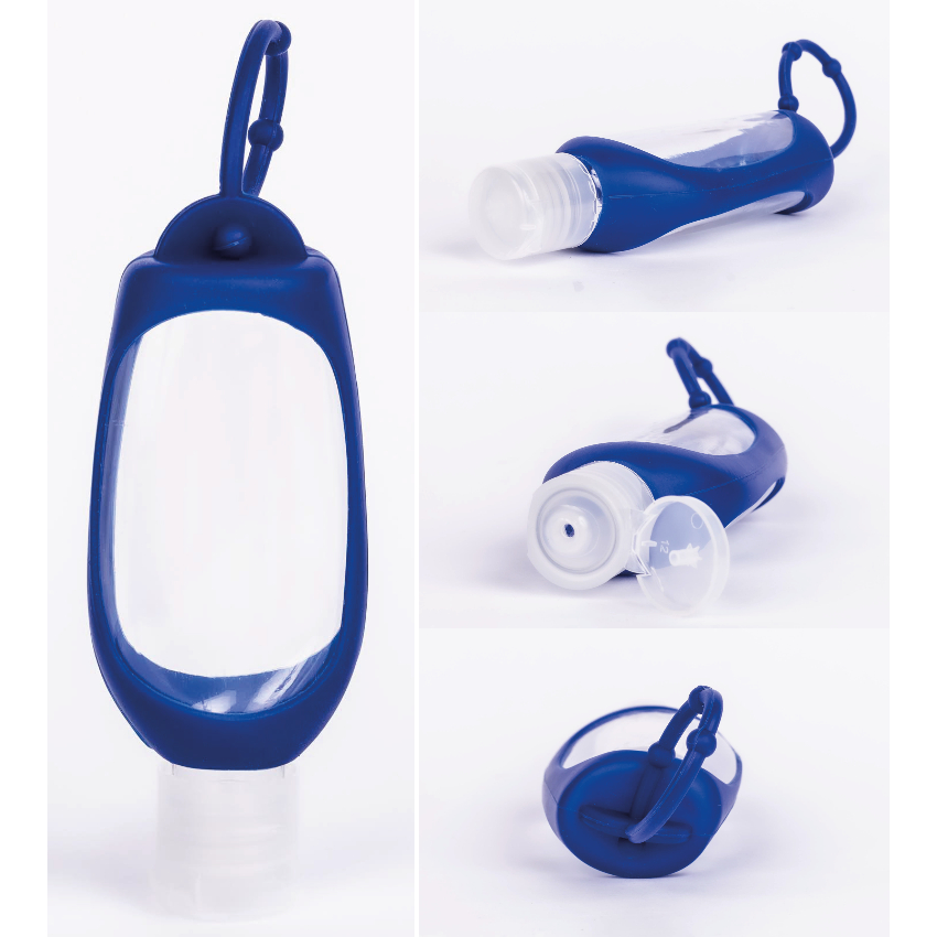 Porta álcool gel em silicone com alça para prender e frasco plástico. Não incluso álcool. Medidas: 4 x 10,5 x 2,5 cm. Capacidade: 60 ml.